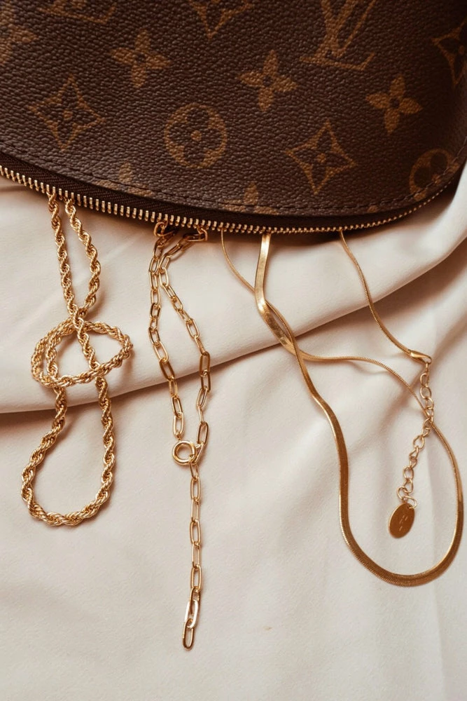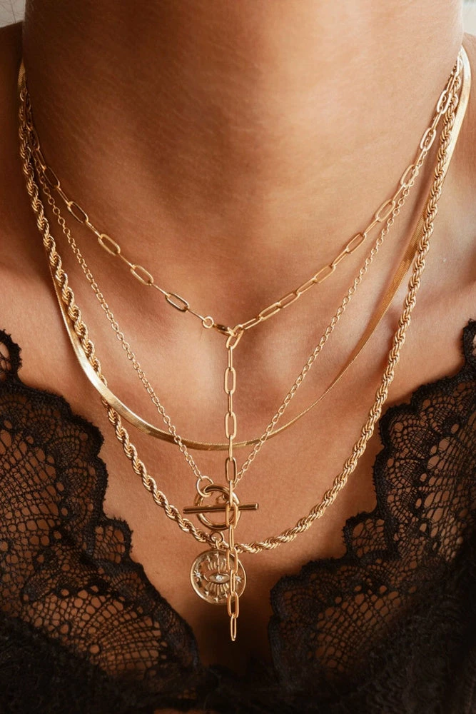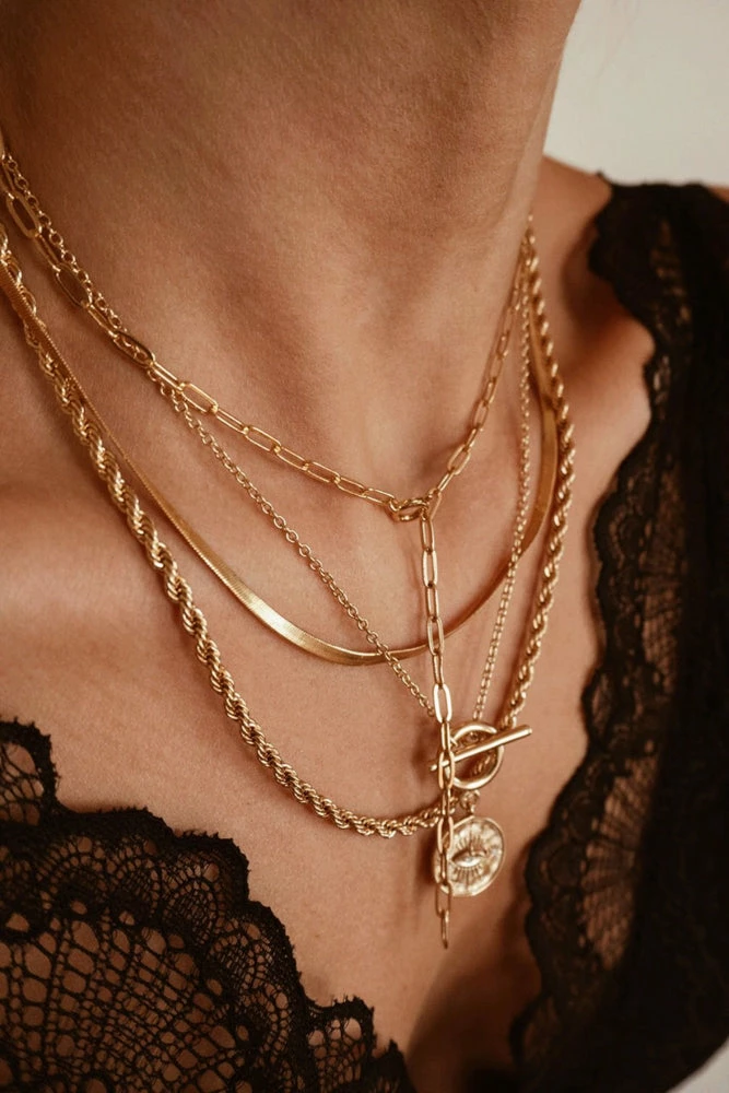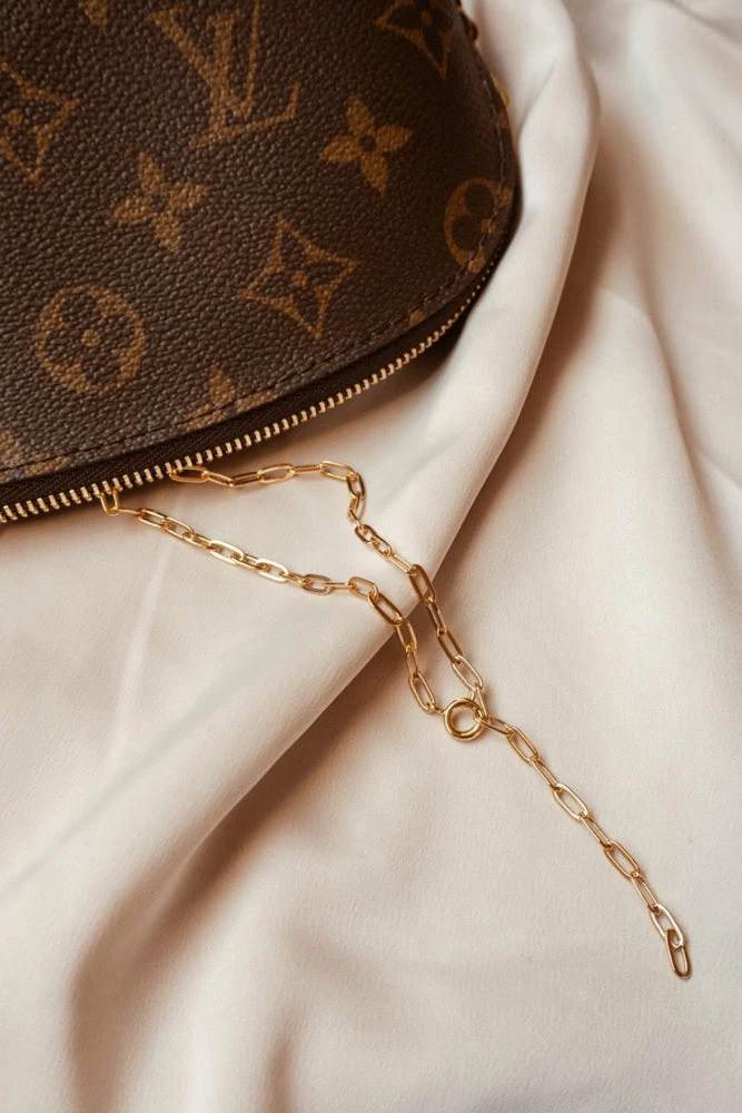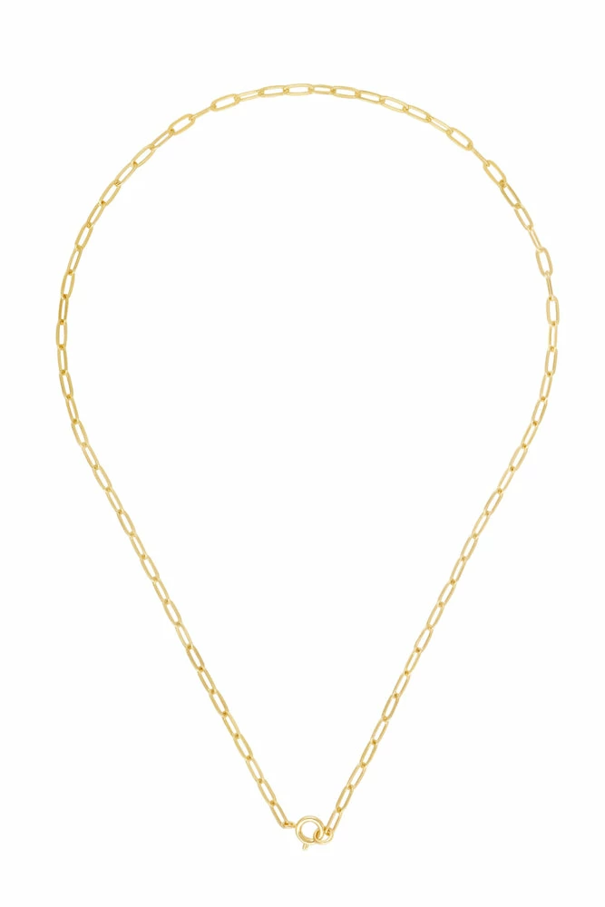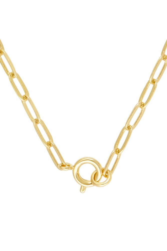 Layering paper clip chain necklace. An extra thick layer of 14k gold plated with brass base. 18″ long. Available in gold. By Five And Two.Â