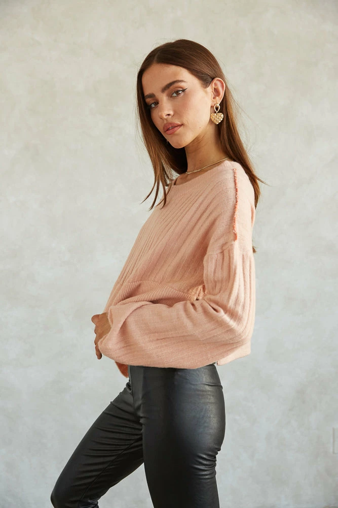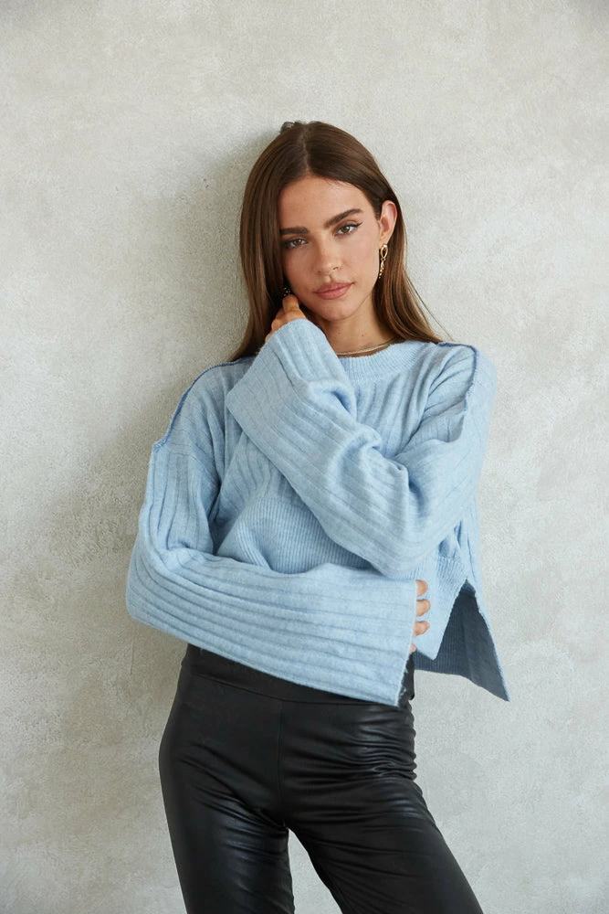 Cuddle on up in the Adele Rib Knit Sweater! Featuring a crew neckline, a relaxed wide rib knit design, stitching details on the shoulders, and side slit details for an edgy touch. Available in blue and blush pink. Pair with the Stefani Satin Mini Skirt for a flirty feminine vibe!