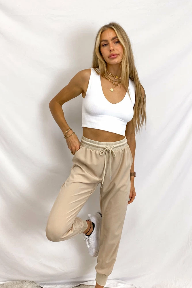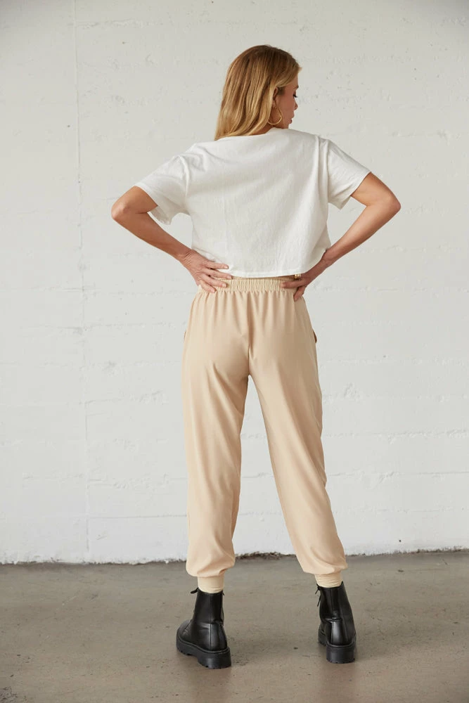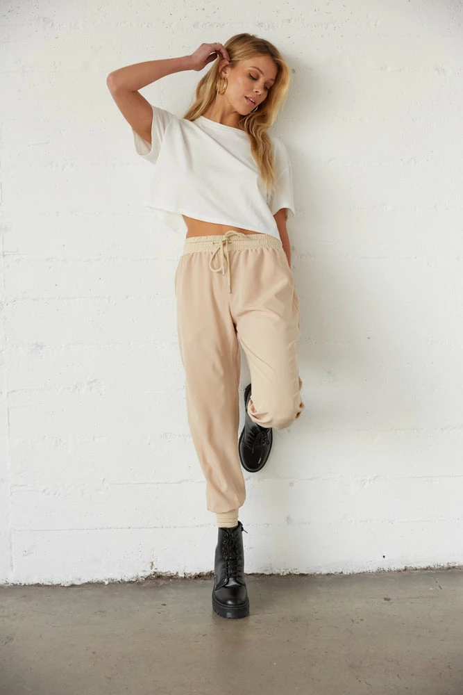 The Abbot Kinney Jogger Pants will be your new everyday essential! Featuring a relaxed high rise fit, a classic jogger silhouette, and a smooth fabric for a sleek final touch. Available in stone and black. Style with the Stevie Cheetah Mesh Crop Top for a funky final touch.