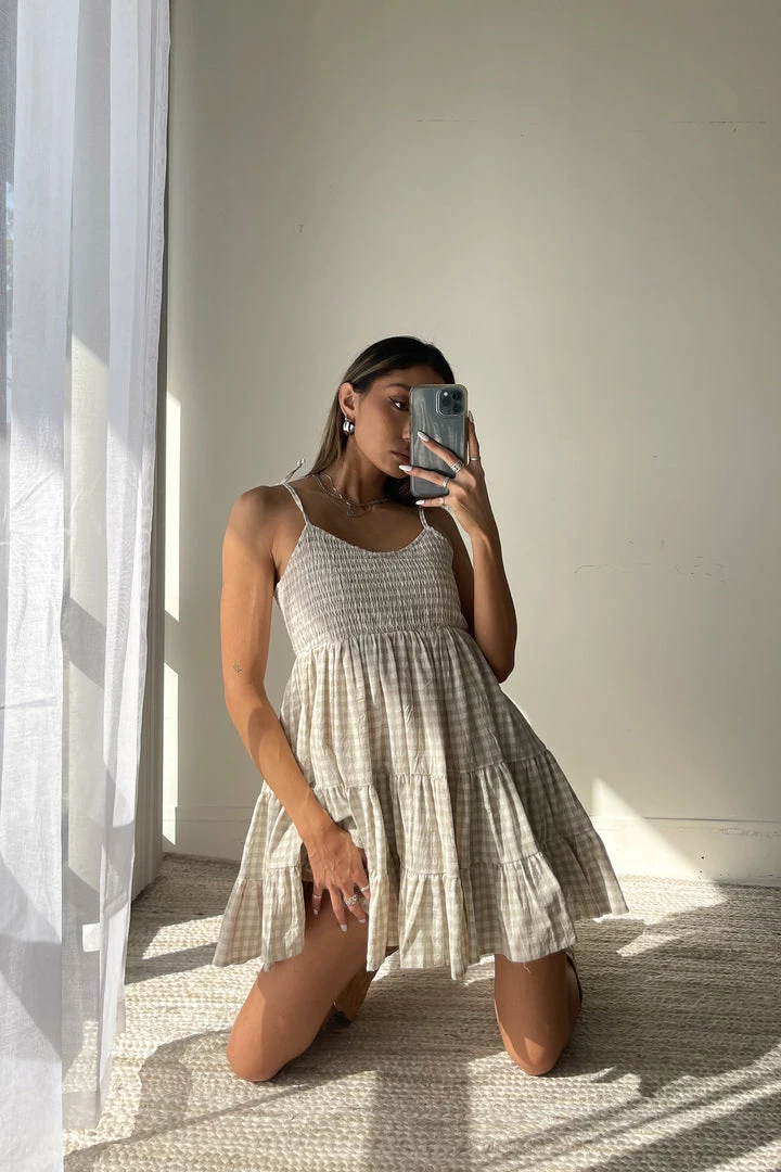 Hey darlin’, meet the Alabama Gingham Babydoll Dress! This adorable piece is complete with a baby v neckline, flirty tie straps, a smocked bust, and a flouncy tiered babydoll silhouette. Available in tan and white. Pair with the Unite Snake Ankle Boot to complete the look!