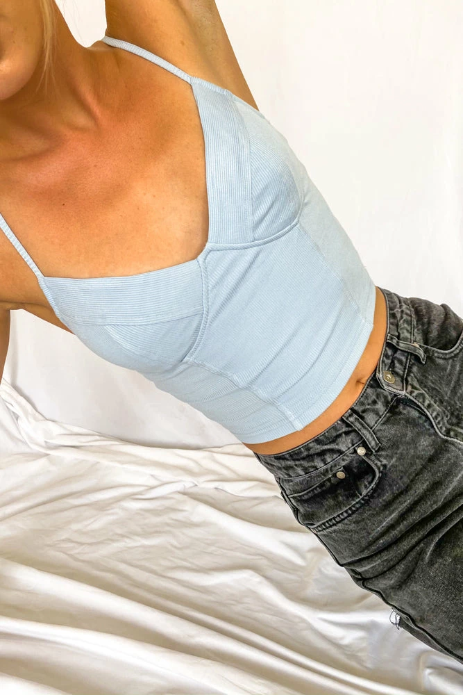 Elevate your style with the Allison Bustier Crop Top! This essential piece features a v neckline, a soft ribbed design, and faux wiring details for a bustier vibe. Available in red, sage green, sky blue, and white. Style this tank top with the Bridget Ruffle Wrap Skort for a flirty touch.