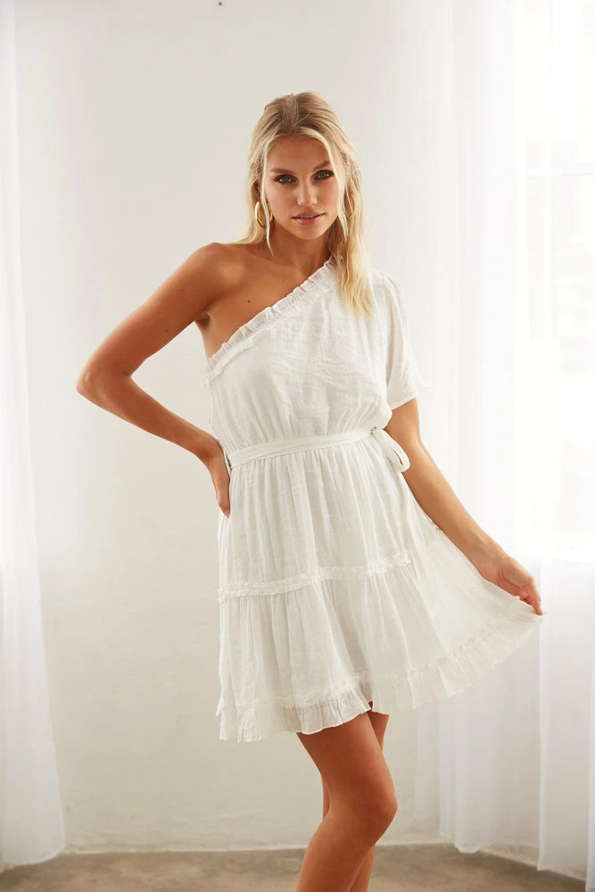 Kick off any summer event with the Amelia One Shoulder Mini Dress! Complete with a longer flowy silhouette, an asymmetrical neckline, tiered ruffle details, and an adjustable tie belt! Available in white. Add on the Five and Two Harper Hoop Earrings to top this look off!