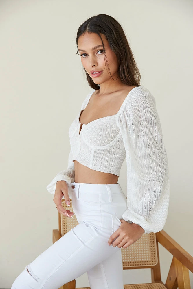 So dreamy in the Avery Corset Crop Top! Featuring a sweetheart neckline with a wire notch v detail, underwire bust and boning for a corset look, sheer long puff sleeves, and an all over lace design with nude underlay for a feminine touch. Available in white and sage green. Complete the look with the Spencer Baggy Straight Jeans.