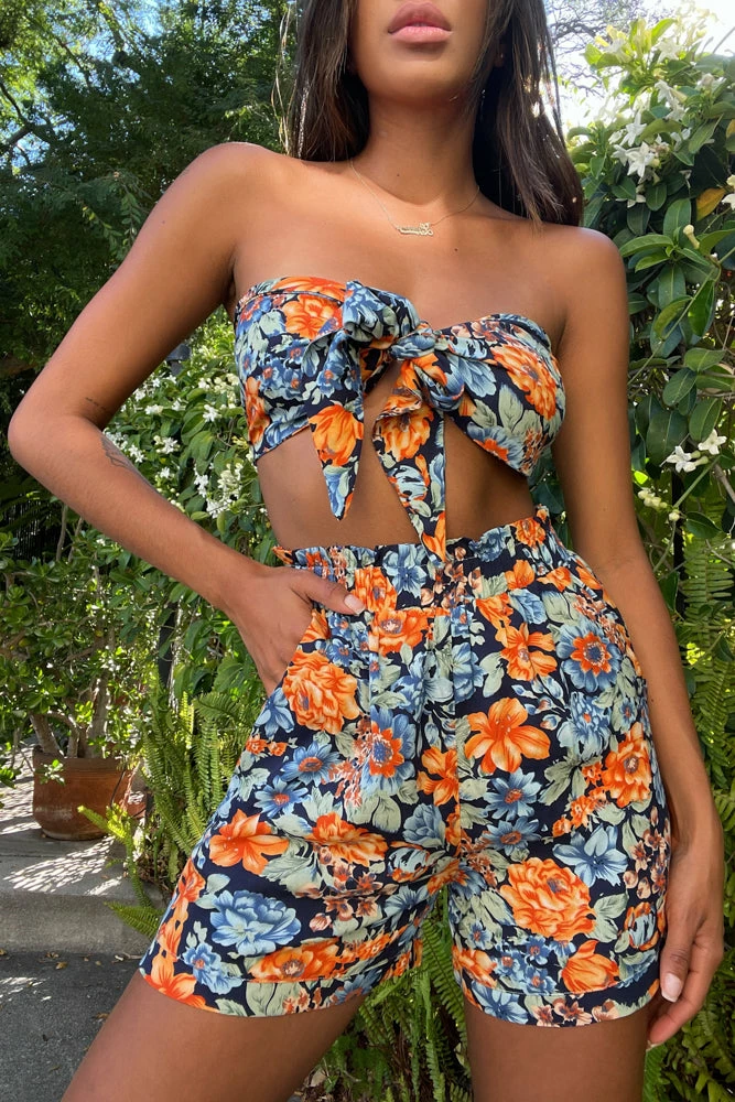 We got you covered for your next tropical vacay in the Cancun Floral Shorts Set! This adorable matching set features a front tie tube top with a smocked back and matching high rise shorts to keep you feeling cool all summer long. Available in an orange and blue floral print. Style with the Cozumel Beaded Mini Handbag for the ultimate vacay look!