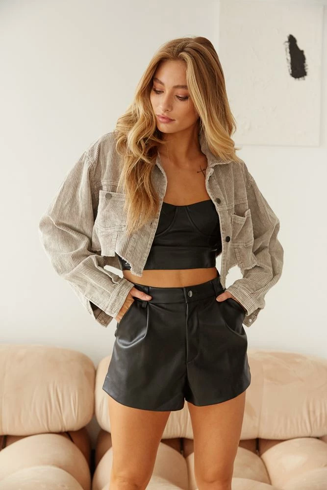 Set trends in our Chance Vintage Wash Corduroy Jacket! This cool layering piece features a cropped raw front hem, two front button pockets, a button up front, and a back embroidered star detail under the collar! Available in black and grey. Style this cord jacket with our Hudson Distressed Straight Jeans and you’ll be set for your next weekend adventure!