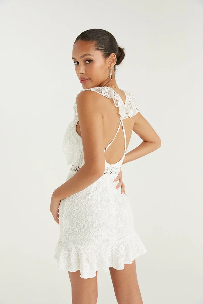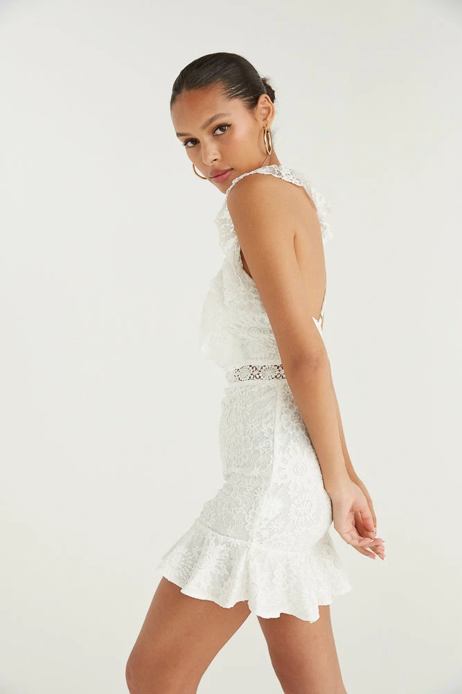 Hey babe, the perfect dress just landed! The Cherry Lace Mini Dress is complete with a v neckline, ruffled straps, cut out details at the waist, a ruffled hem, and a lacey bodice for a feminine touch. Available in white. Pair with the Shelby Woven Double Strap Heel in Bone for an all-white look!