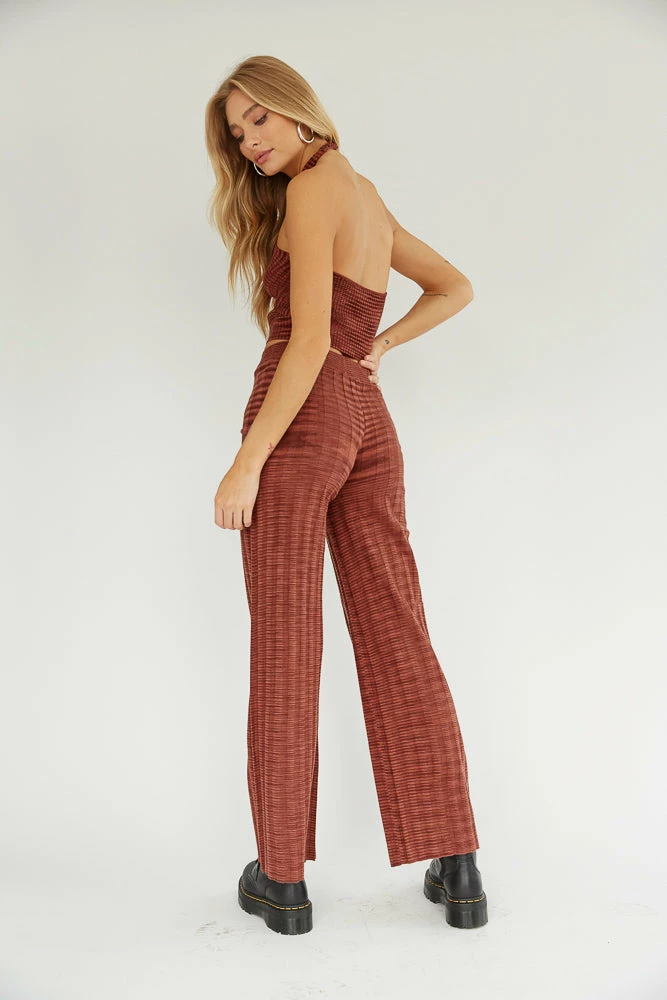 Hey babe, we’re FALLing for the Cody Ribbed Wide Leg Pants! These textured pants are complete with a high rise fit, a cozy rib knit design, and a retro striped print throughout. Available in brown. Make this look a set with the Noel Ribbed Halter Top!