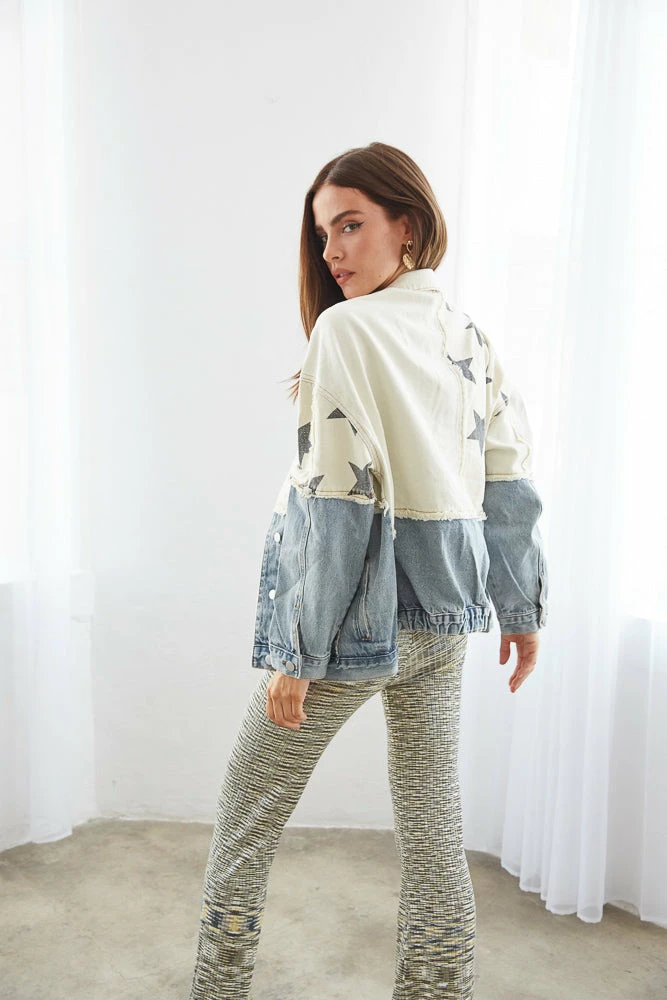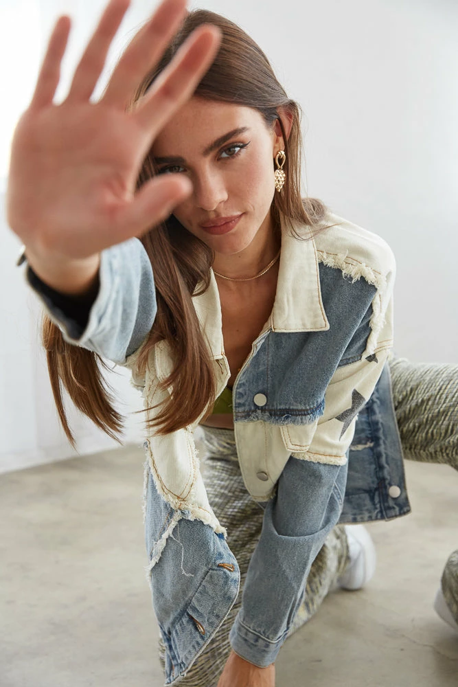 Hey babe, fall in love with the Colt Star Denim Jacket! This jean jacket is complete with a white and medium wash color block design, front pockets, printed starts, and frayed patchwork distressing for an edgy final touch. Throw this statement piece on over the Mattie Twist Crop Top!