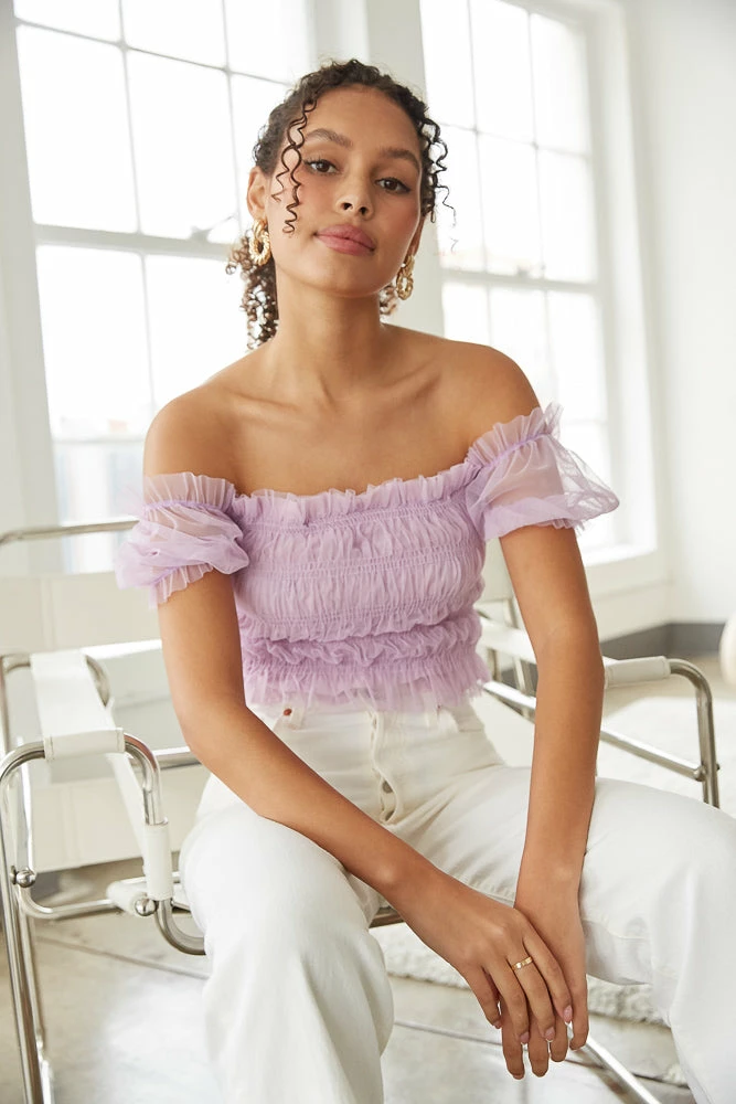 Hey babe, stroll through the city in this fresh and flirty tulle statement top. The Covent Garden crop top features ruffled tulle with sheer puff sleeves. Create the perfect summer outfit with the Sunrise Distressed Denim Shorts.