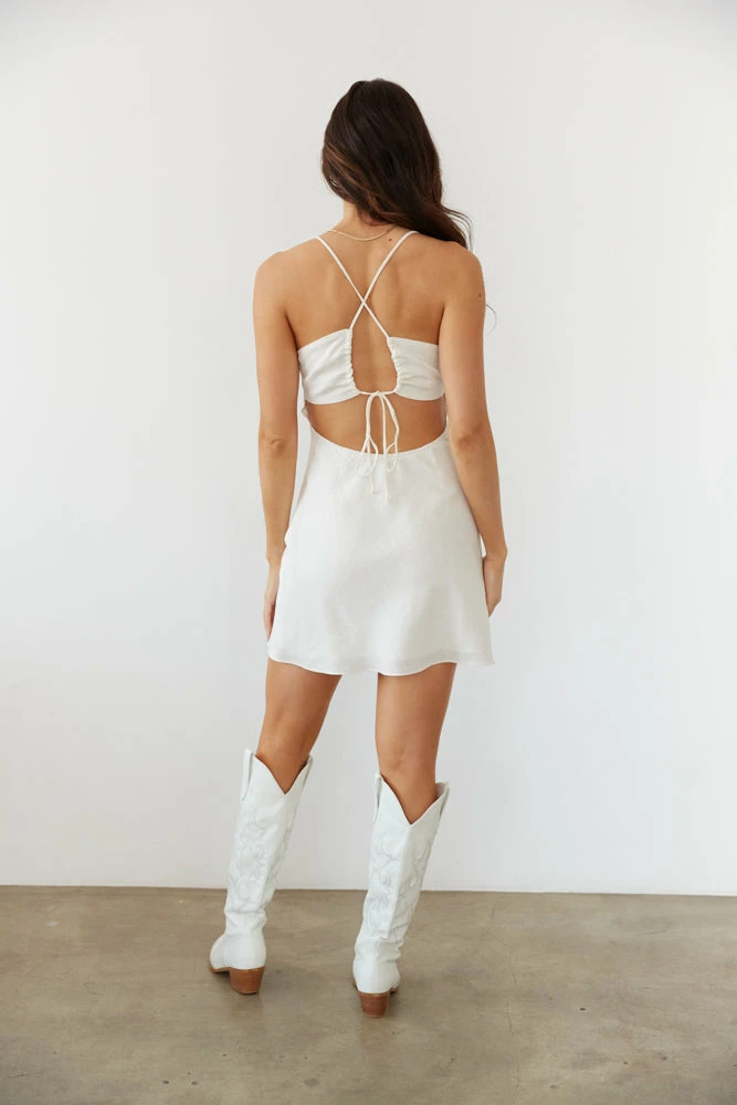 So stunning in the Cyprus Mini Dress! Featuring a twist scoop neckline with a keyhole detail, an open back with adjustable ties, a linen blend fabric, and a mini length. Available in white. Step into your favorite cowgirl boots for a western look!