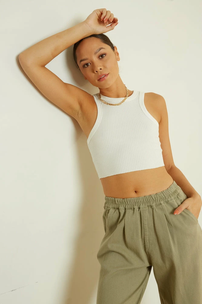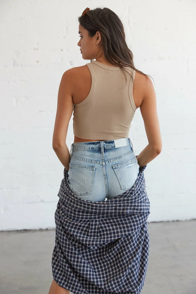 Get ready to live in our Daniella Ribbed Racerback Tank. This tank features a cropped silhouette, a racerback design, and a ribbed knit fabric for an easy fit. Available in mocha, green, white, light blue, and black. Pair with our Pistola Devin High Rise Mom Cut Off Shorts for a ’90s inspired look!