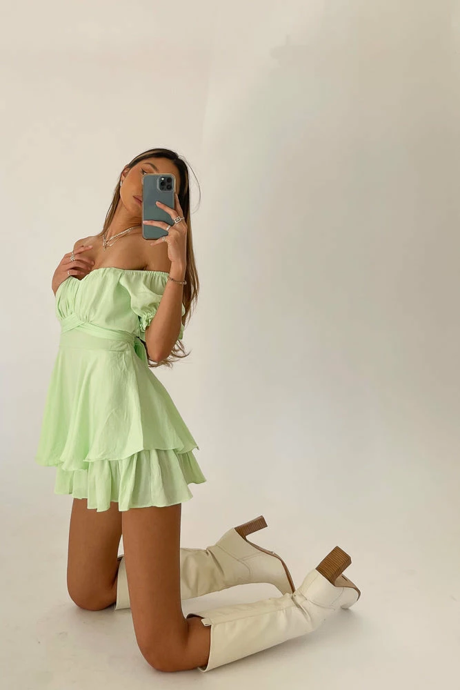 Simply beautiful in our Lime Green Eleanor Ruffle Wrap Romper! Featuring a sweetheart neckline with a ruched bust, an adjustable wrap around tie, short ruffle trim puff sleeves that can be worn on or off the shoulder, and a dreamy tiered ruffle skirt for a femme final touch. Also available in white, yellow, lavender, and coral pink. Style with the Jeana Block Heel to complete this dreamy look.