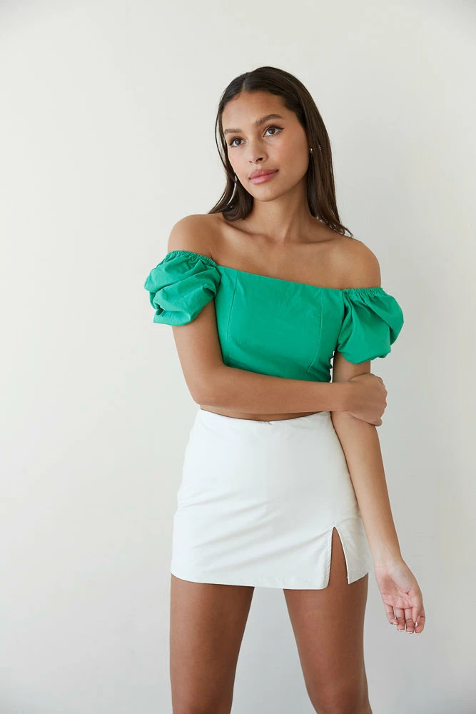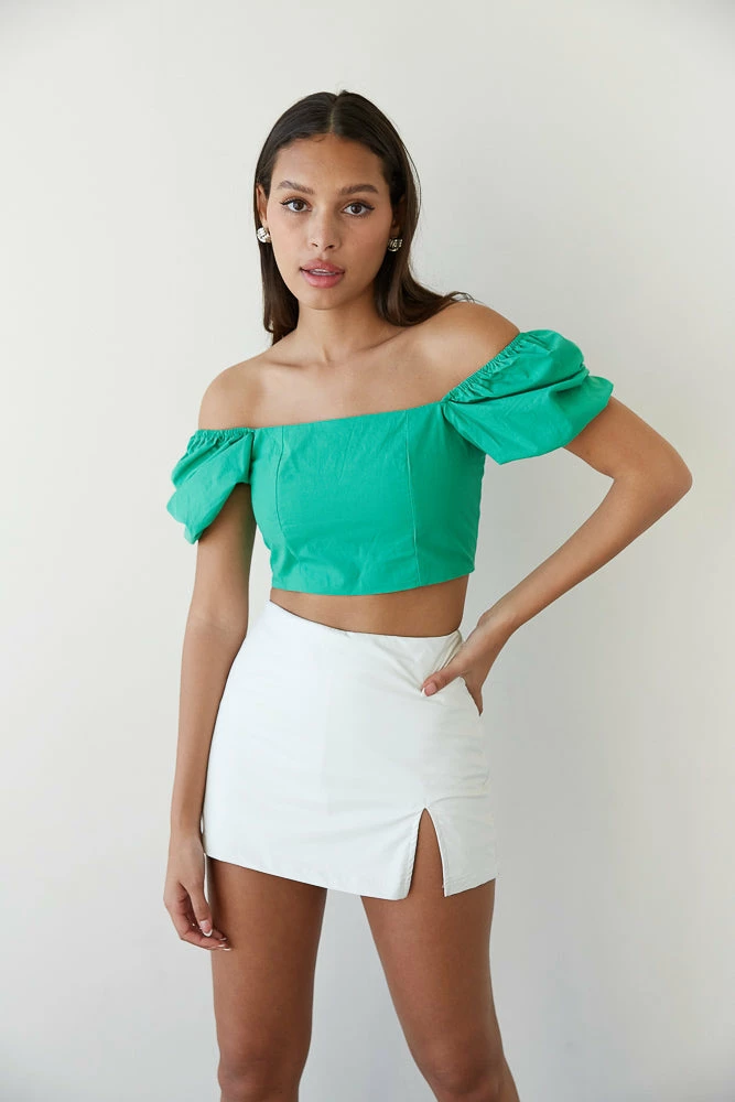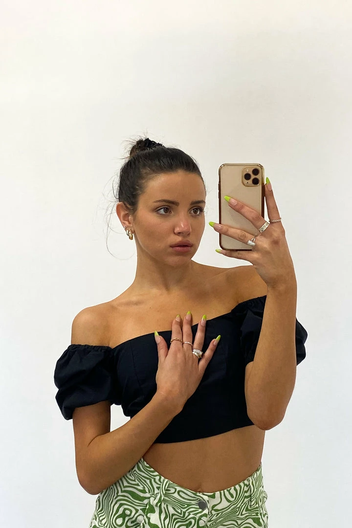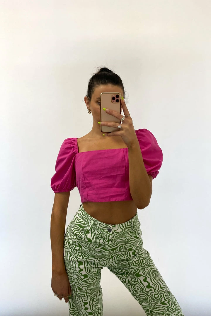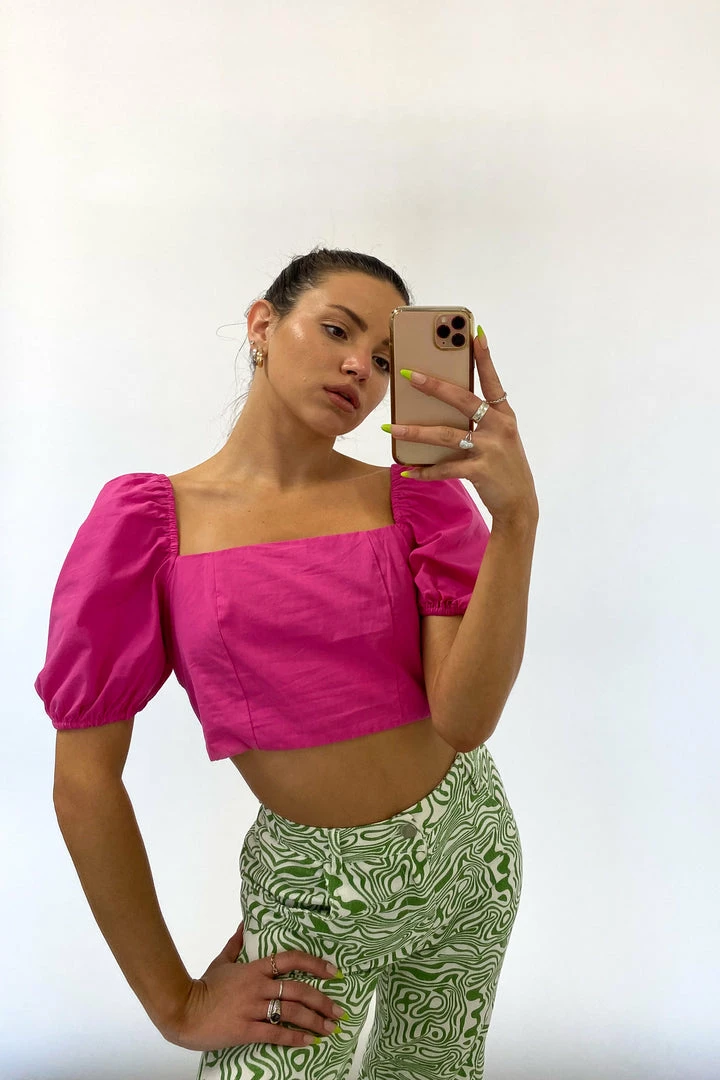 Ooh, girl! The Electric Feel Crop Top is the perfect piece to elevate your look. Featuring a square neckline, puff sleeves that can be worn on or off the shoulder, a lace up back design, and a fitted cropped silhouette. Available in black, green, and hot pink. Pair with the Levi’s High Rise Dad Jean for a casual vibe.