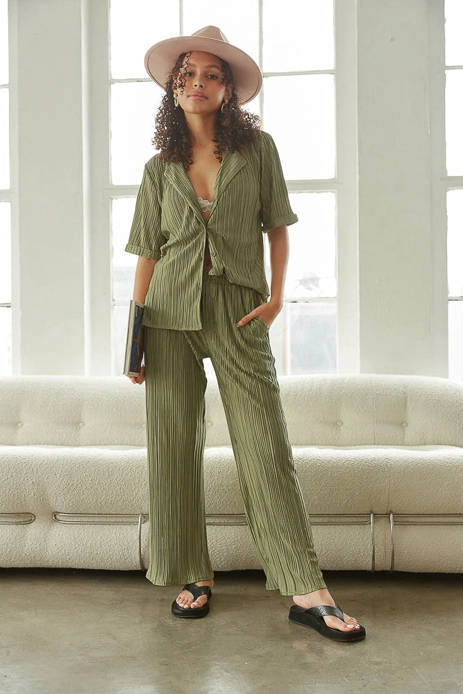 Hey babe, get cozy on vacay! The Elisa Wide Leg Pleated Pant comes in an olive green pleated silky satin fabric. Pair them with the Amara Pleated Button Up Shirt to complete this matching set.