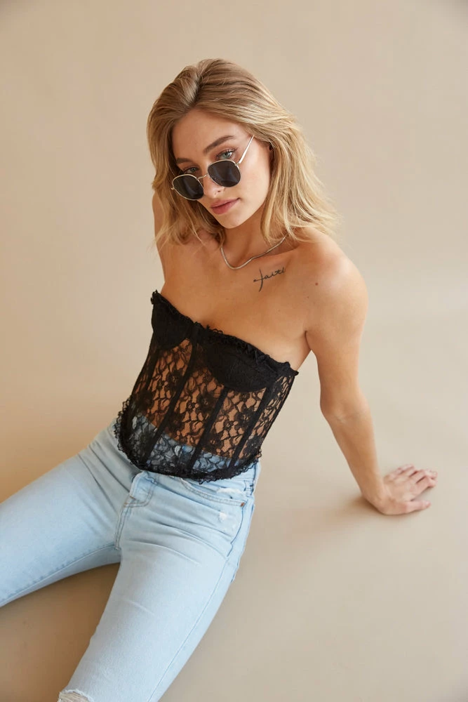 Turn heads in the Field of Dreams Lace Bustier Top! Featuring a strapless sweetheart neckline, a pointed hem, a lace mesh bodice, and inner boning for a corset look. Available in white and black. Pair with the Levi’s Wedgie Straight Jeans for the ultimate baddie look!