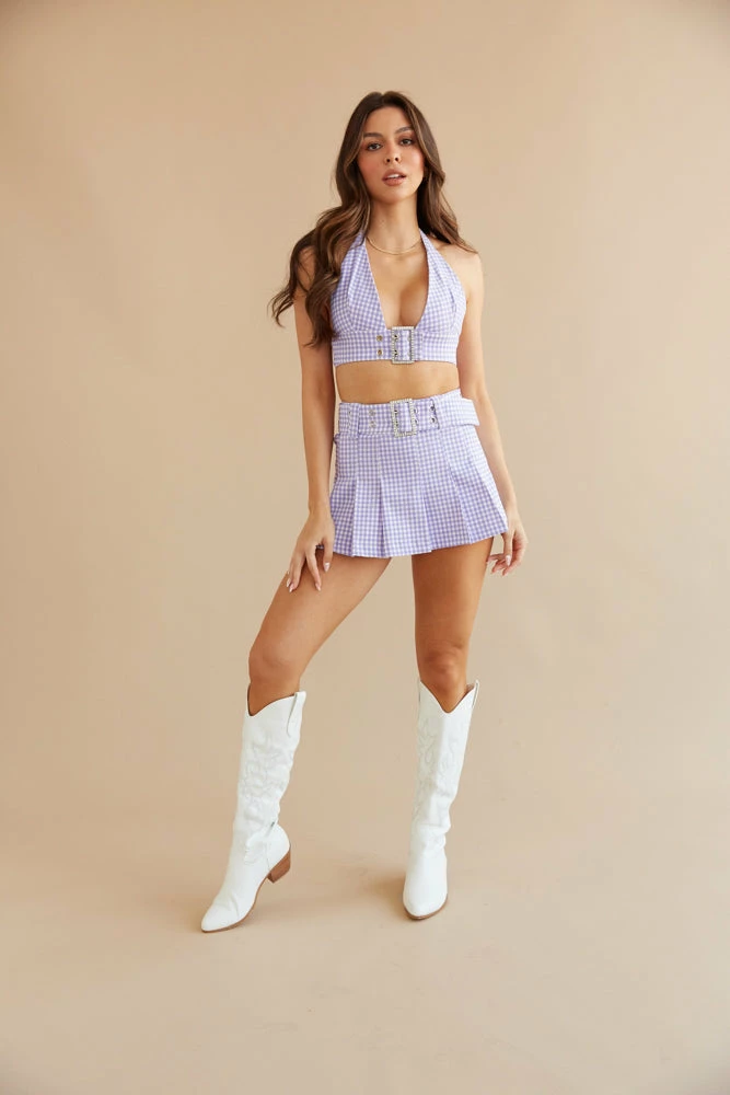 Hey babe, meet the Gemini Gingham Halter Crop Top! This triangle crop top is perfect for summer vacation in a lavender purple gingham print. Featuring a rhinestone buckle detail at the bust and an adjustable halter tie. Make this look a set with the Gemini Gingham Pleated Mini Skirt.