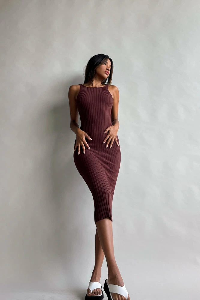 Hey dream girl, slip into the Hadassah Open Back Midi Dress for your next date night! Featuring a high boat neckline, a soft rib knit design, and a deep open back cut out for a glimpse of skin. Available in chocolate brown. Step into the Kora Twisted Strap Heel in Black for an elegant finish.