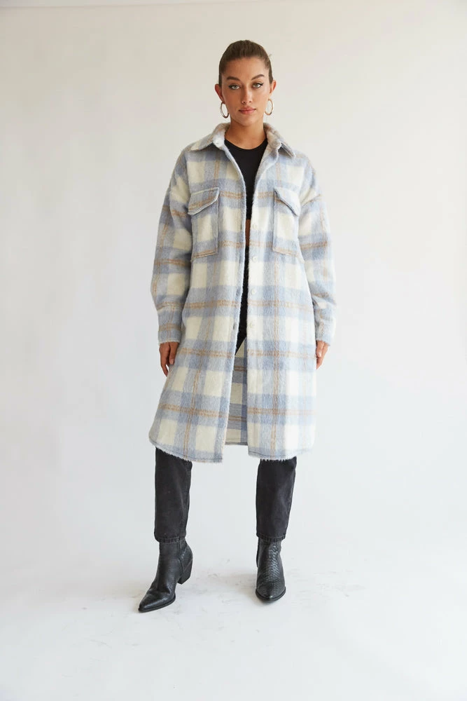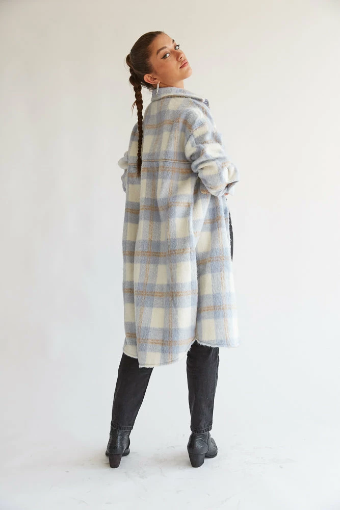 Looking chic on the streets in the Hilton Fuzzy Plaid Shacket! Featuring a button up front, two front buttoned pockets, a long boxy silhouette, side slits, and a fuzzy plaid print. Available in blue, brown, and white. Style with the Wynona Long Combat Boots for an IG worthy look.