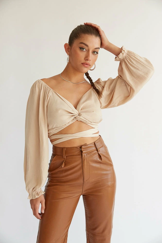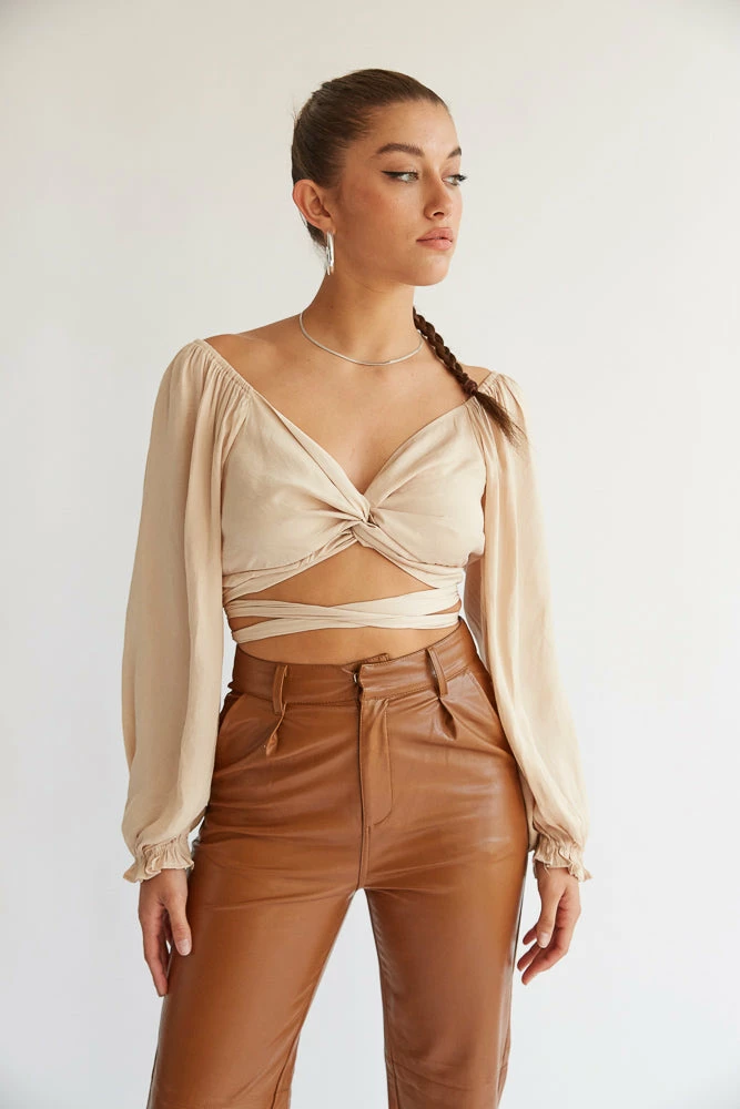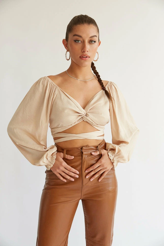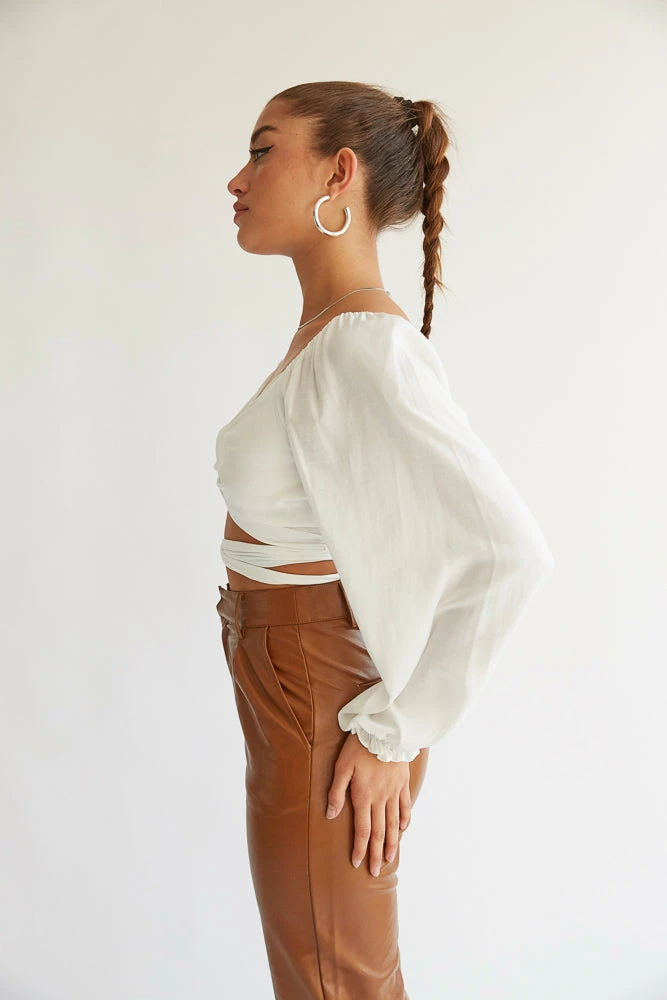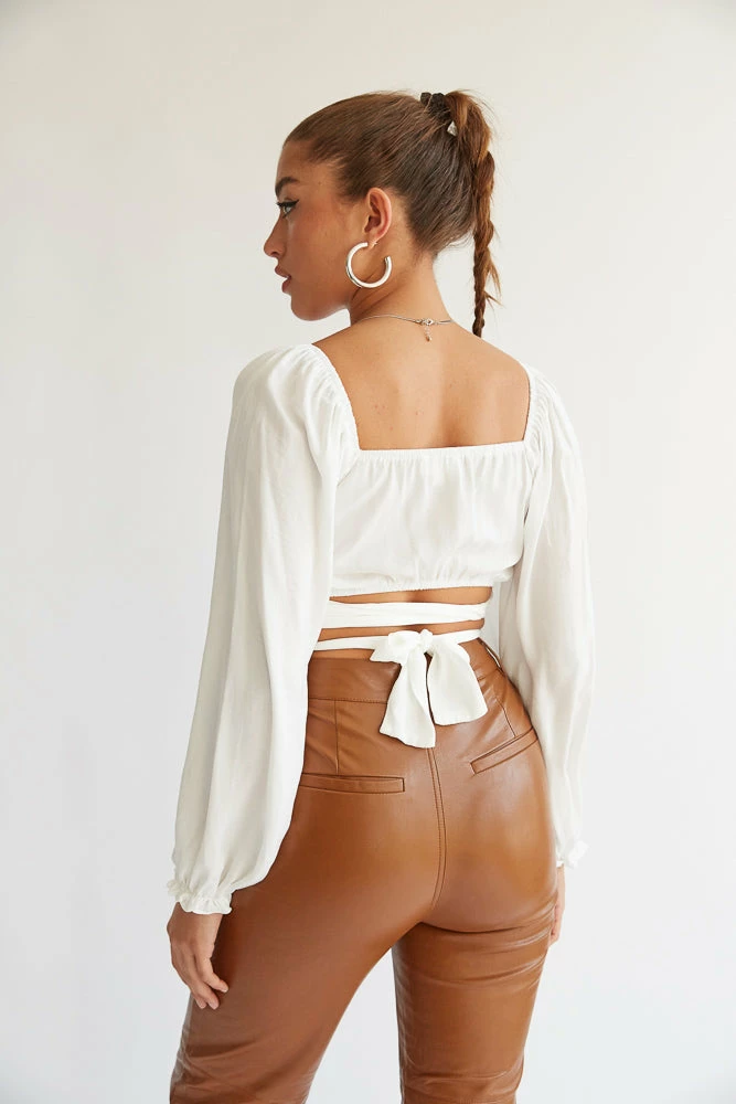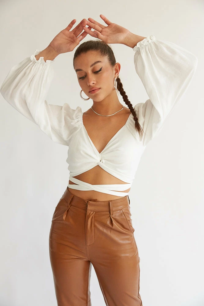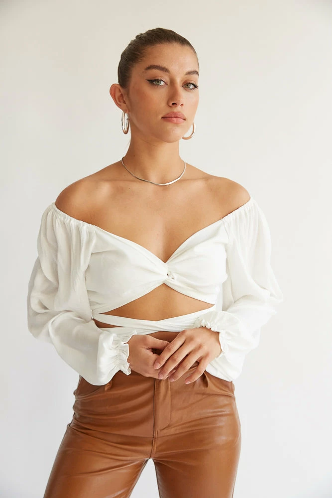 Fall in love with the Jolie Puff Crop Top! Featuring a sweetheart neckline with a twist front design, ruffle puff sleeves, and an adjustable waist tie detail for a flirty final touch. Available in white and nude. Add the Destiny Large Hoop Earrings to your look for a final touch!