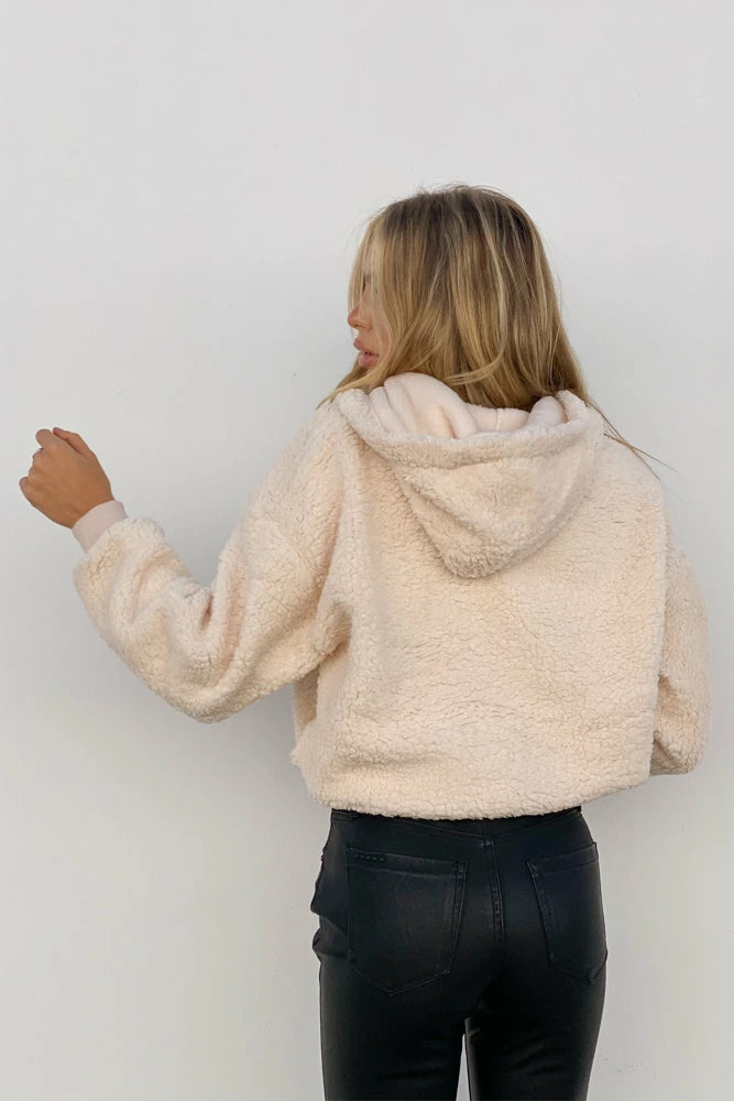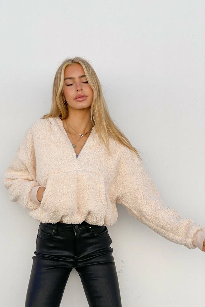 The Kirby Crop Sherpa Half Zip Hoodie is the jacket you need this season! This super cozy sweatshirt is complete with a half zip up front, an adjustable drawstring at the hemline, an ultra soft teddy design, and a relaxed cropped hoodie silhouette. Available in cream. Style this teddy with the Spoiler Alert Vegan Leather Pants for a casual-cool look.