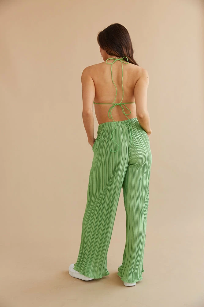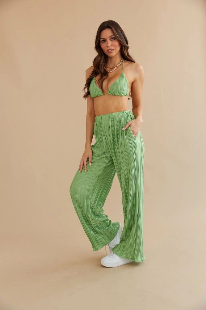 Hey babe, chill by the pool in the cutest matching set! The Manana PlissĂ© Pants Set comes in hot pink and lime greenâ summer’s hottest colors! This pleated a gorgeous wide leg lounge pant and a matching string triangle bikini top. Complete this outfit with the Yogi Slide Sandals for the ultimate lounge look.Â