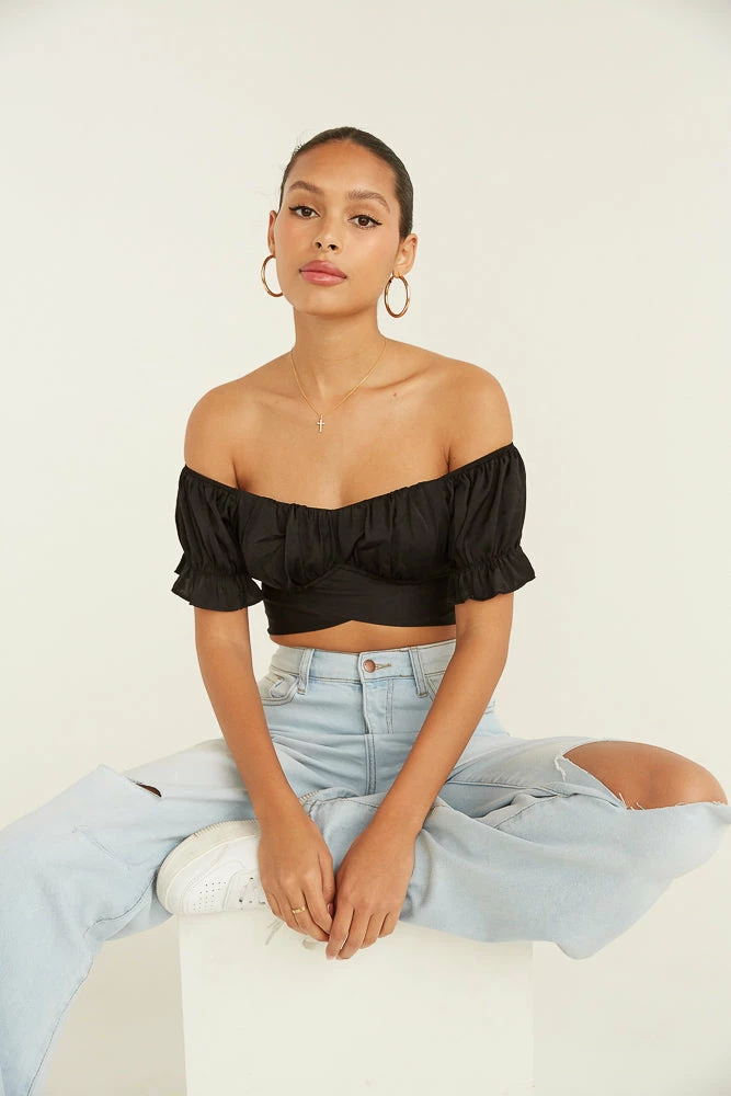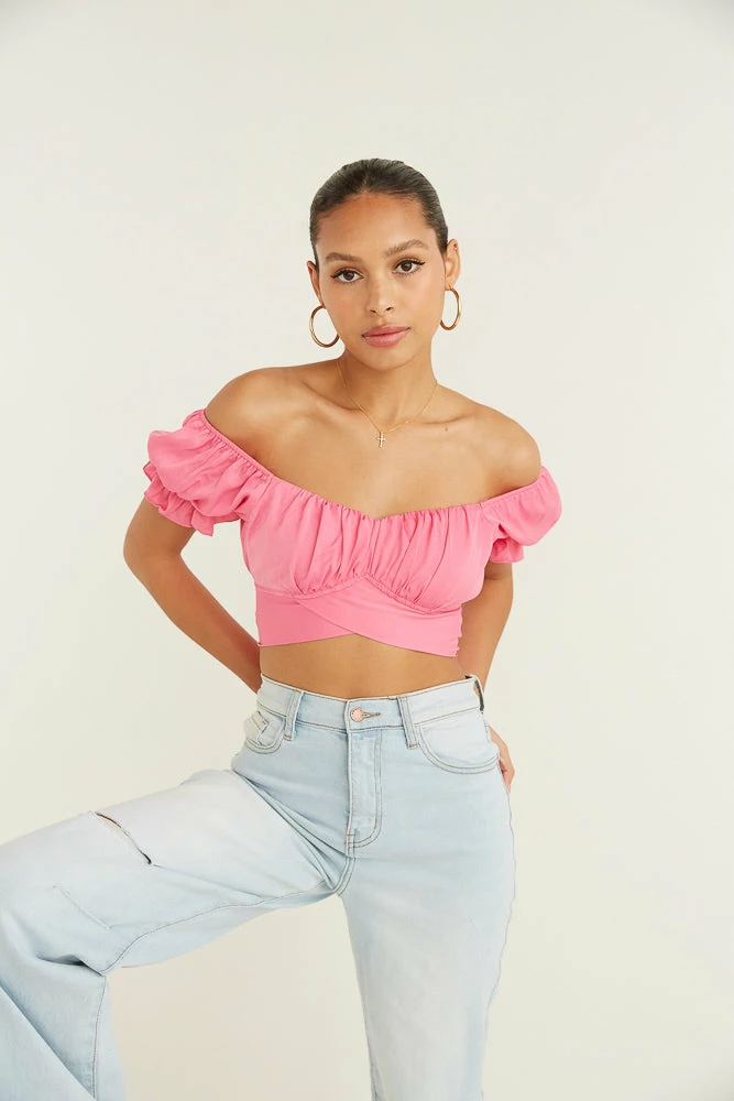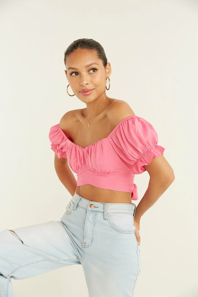 Lookin’ cute in the Mara Puff Crop Top! Featuring a sweetheart neckline with a ruched bust, short puff sleeves with a ruffle trim, and a wrap waist tie for a flirty final touch. Available in pink and black. Complete your look by accessorizing with the Lorissa Nylon Purse in Beige.