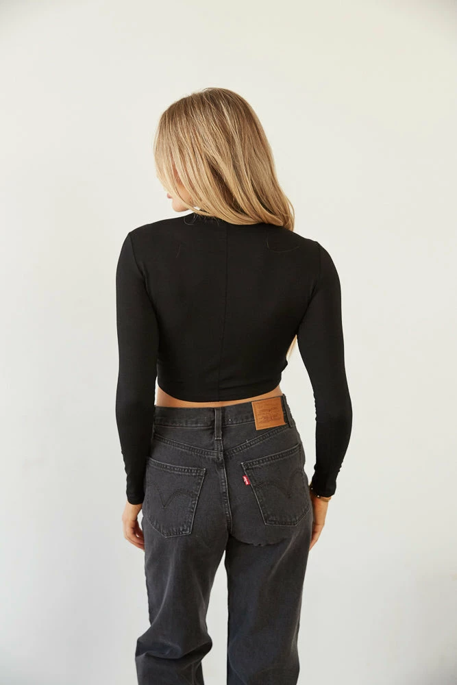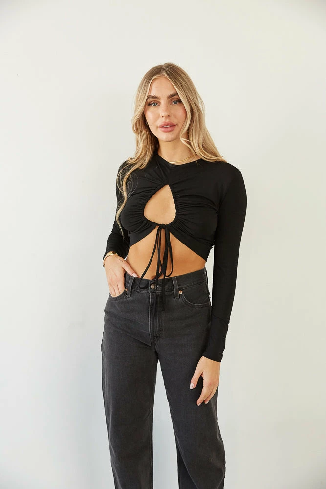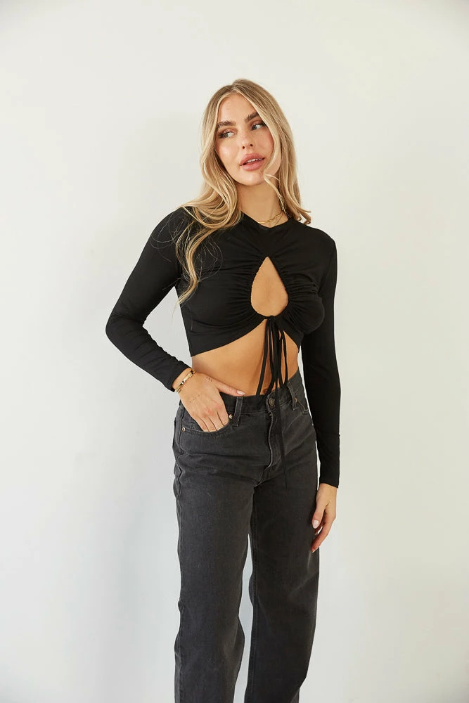 Feeling edgy? Slip into the Maxine Cinched Crop Top! Featuring a crew neckline, a fitted silhouette, and an adjustable cinch front cut out detail for a sexy peek of skin. Available in black. Pair with the Levi’s High Rise Dad Jean for a monochromatic look!