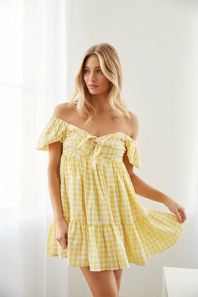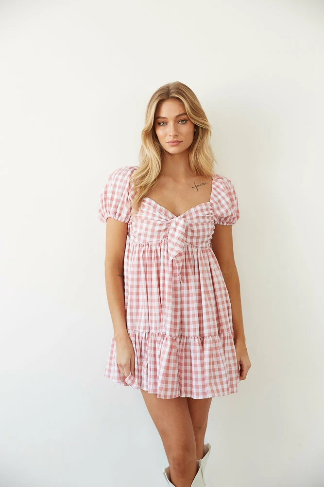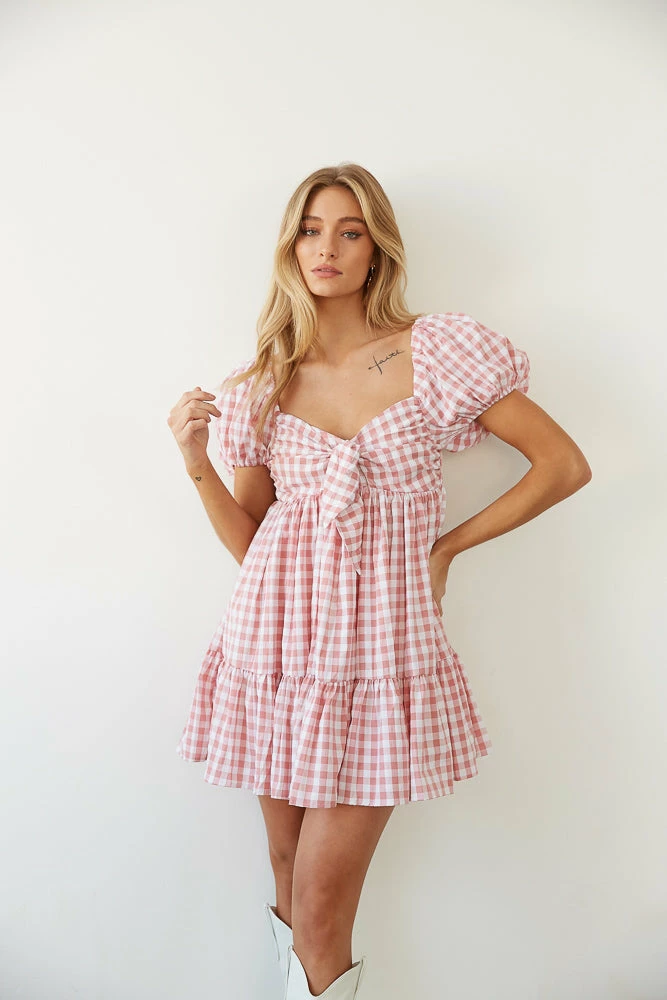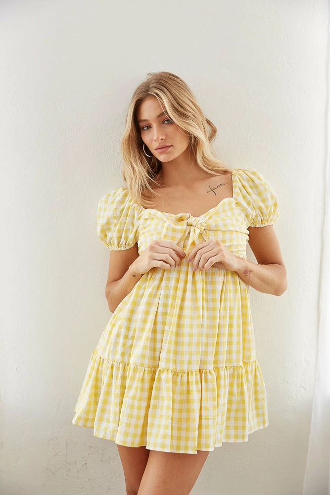Ready for some fun in the May Gingham Babydoll Dress! Featuring a sweetheart neckline with a keyhole detail, an adjustable front tie, a tiered flouncy silhouette, and short puff sleeves for a feminine final touch. Bonus– this mini dress has side pockets! Available in pink and yellow. Step into the Urson Tall Western Boots in White for a rodeo ready look!