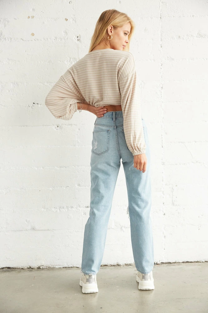 Look cute & feel comfy in the Millie Striped Long Sleeve Crop Top. This crewneck top features a relaxed cropped silhouette, an adjustable drawstring tie on hem, and long balloon sleeves. Available in a soft lightweight design in beige and white stripes. Complete the look with our 501 Skinny Jeans In Black.Â