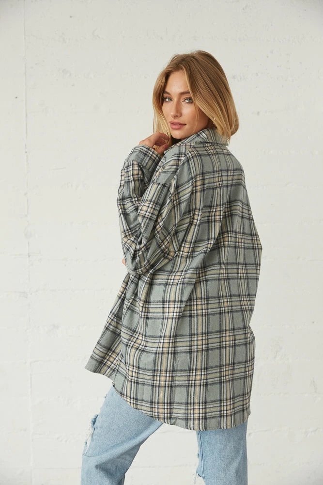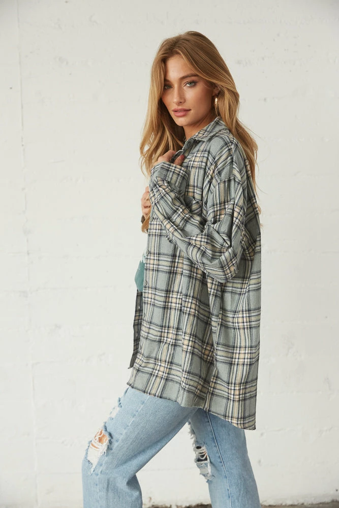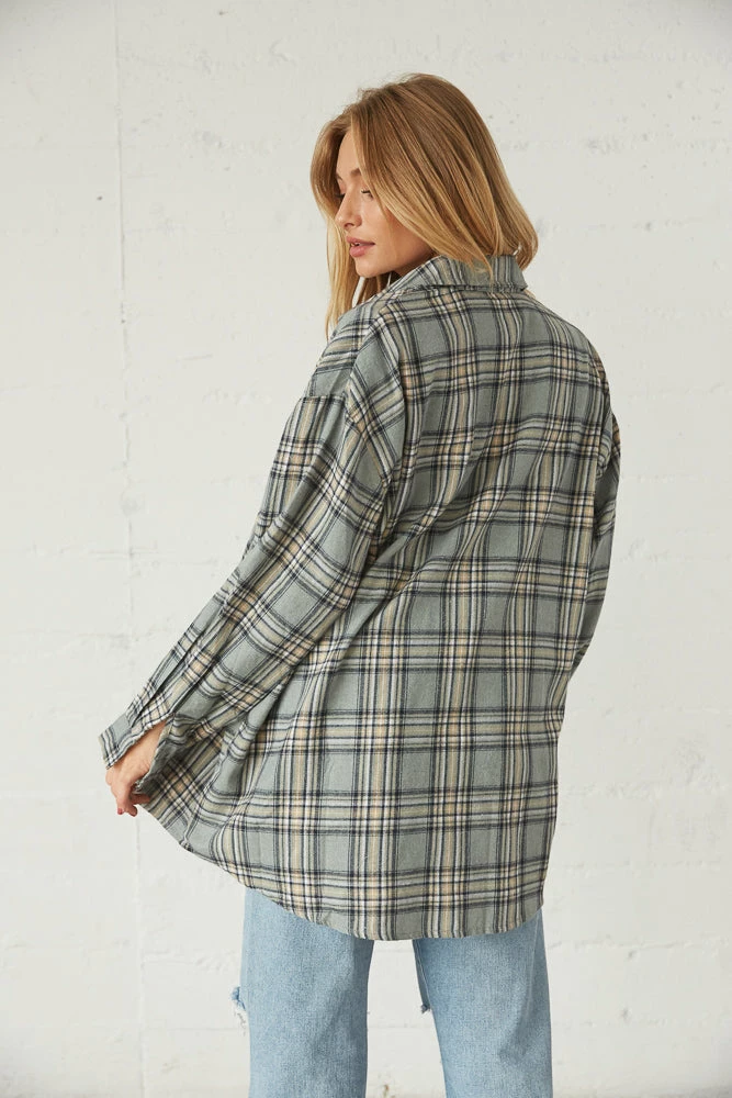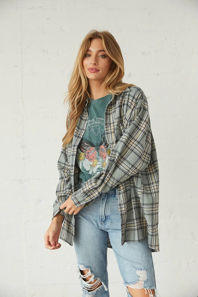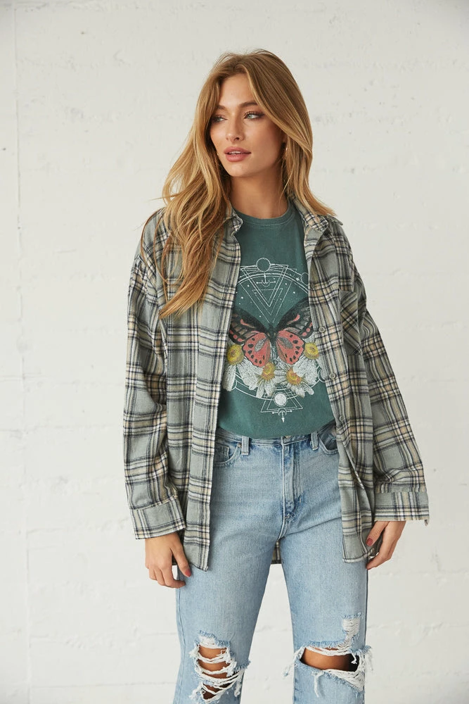 Ready for an adventure? The Mitchell Plaid Flannel Shirt is perfect for all of your fall festivities! Featuring a classic button up front, a front pocket detail, a relaxed boxy silhouette, and a soft plaid design. Available in sage green. Throw this layering piece over the Gillian Butterfly Graphic Tee for a casual & cute look!