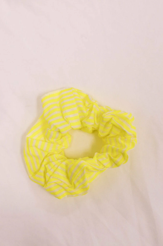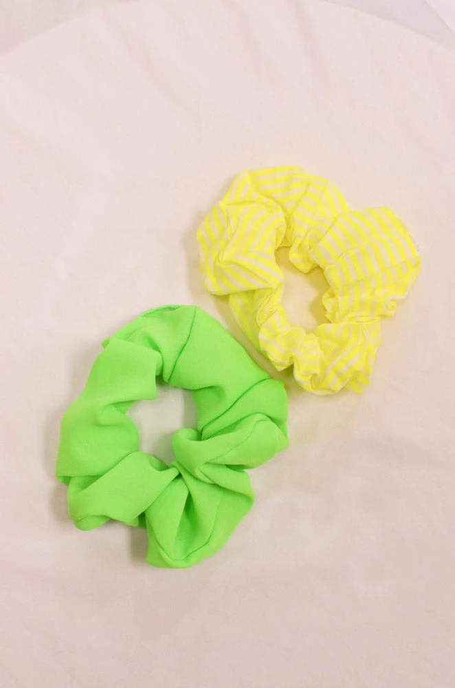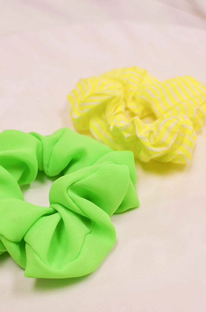 Fall in love with in the Nayla Neon Scrunchie Set. Featuring a soft lightweight design and an elastic body for the perfect top knot bun! This set comes with neon green, and neon yellow + white striped.