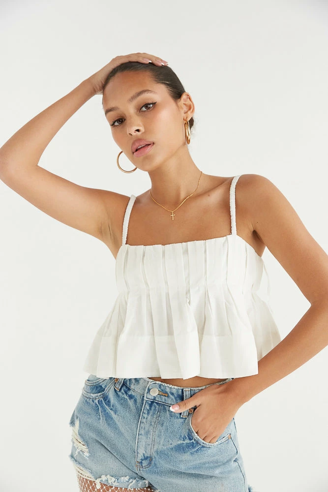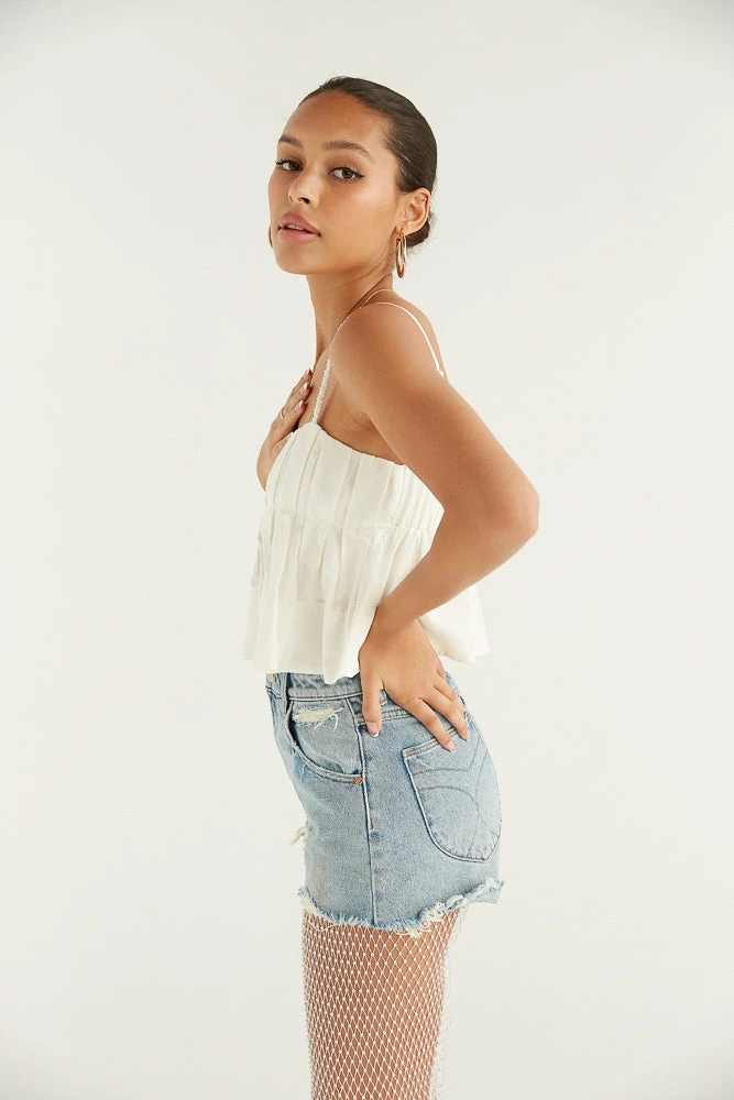 Soak up the sun in the Nellie Ruffle Crop Top! This adorable piece is complete with bungee tank straps, a square neckline, and a ruffled peplum bodice for a flirty final touch. Available in white and sage green. Pair with the Pax Destroyed Denim Shorts for a summery vibe!