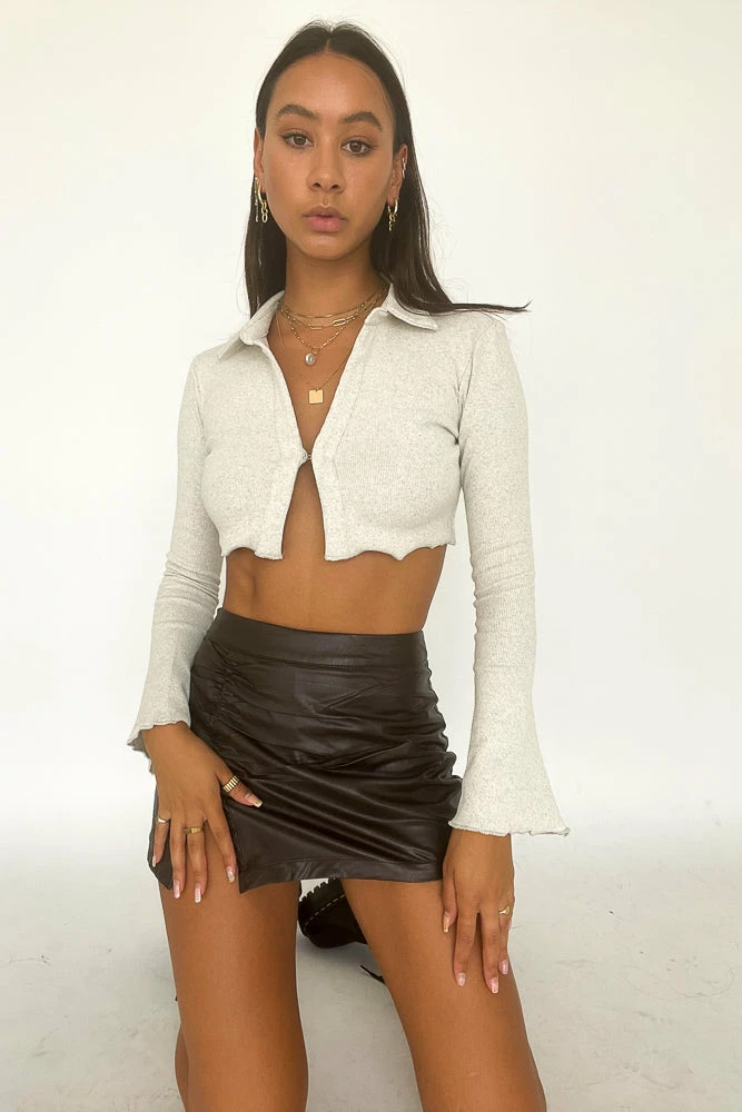 Hey babe, fall in love with the Cyrus Collared Crop Top! Featuring a collared v neckline, lettuce edge hem, flare sleeves, a soft ribbed material, and a cropped silhouette. Available in pink and grey. Pair with the Leila Vegan Leather Mini Skort for a flirty date night look!