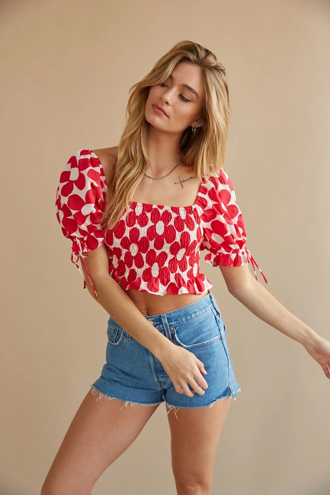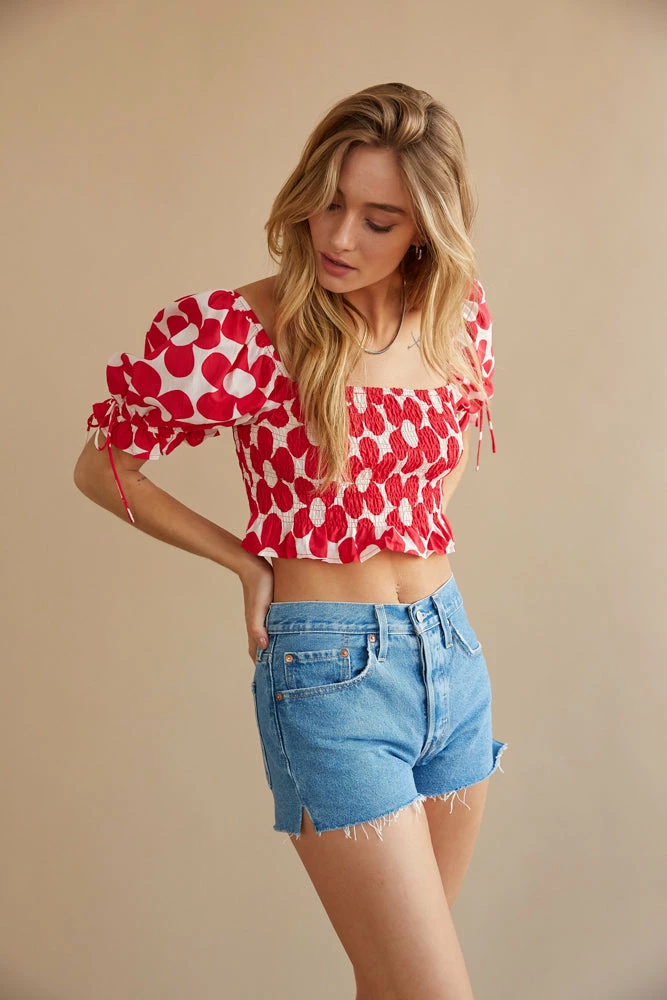 Turn heads in the Daisy Puff Crop Top! This cropped silhouette features a red and white retro floral pattern, a smocked bodice, and short puff sleeves with a bow detail. Complete the look with the Levi’s 501 Distressed Shorts in Light Wash.