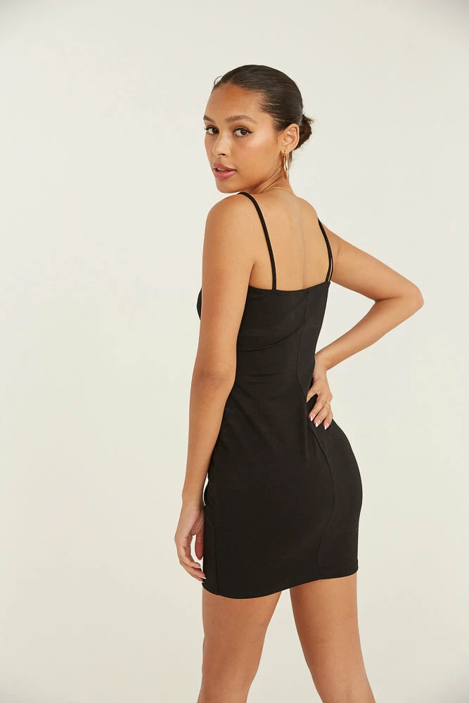 Simply stunning in the Dirty Martini Mini Dress! Featuring a cinched v neckline with a keyhole cut out detail, an asymmetrical strappy design, and a flattering bodycon silhouette. Available in black. Pair with the Cass Strappy Heel in Black for a sexy + fun look!