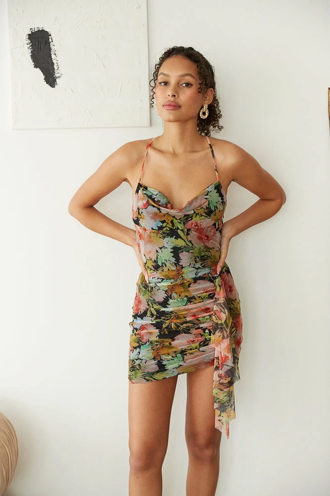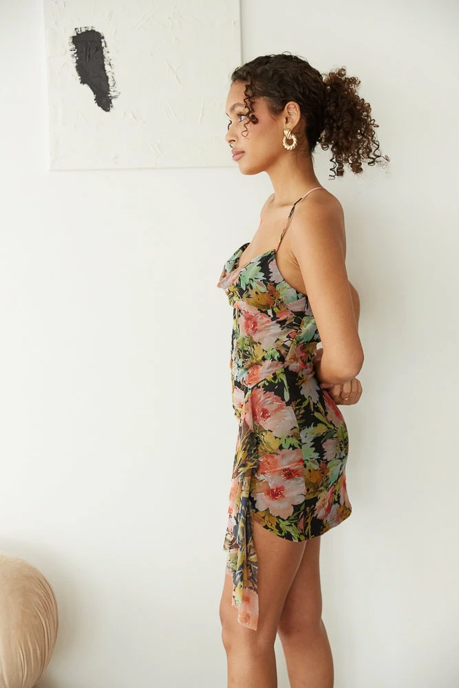 Dance the night away in this spicy number. Monet is an open back mini dress with a subtle cowl neckline, This black watercolor floral dress is accented with a beautiful ruffle detail. Pair with the Yanti Block Heels for a night out, or go for a more casual 90s vibe with the Britney Flatform Sandals.