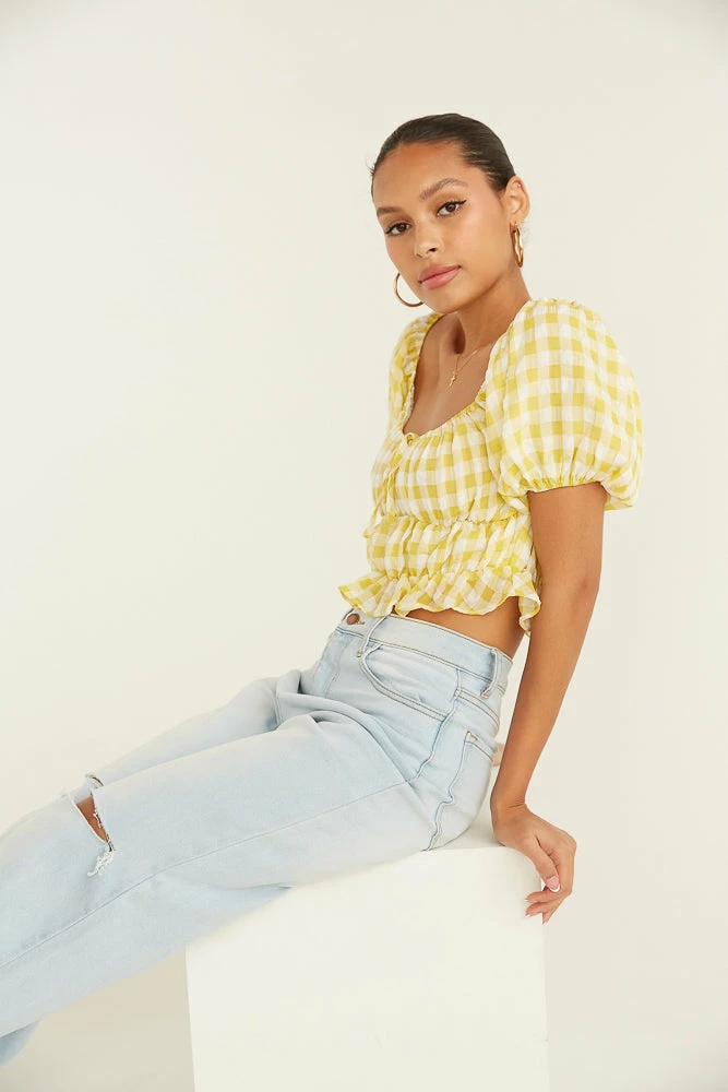 Feelin’ cool as a breeze in the Pamela Gingham Crop Top! Featuring a square neckline, a bow tie detail, short puff sleeves, a flattering ruched bodice, and the cutest textured plaid gingham print. Available in yellow and white. Pair with your fave light wash jeans for a casual cute vibe!