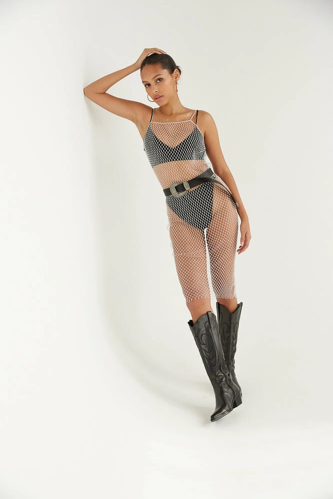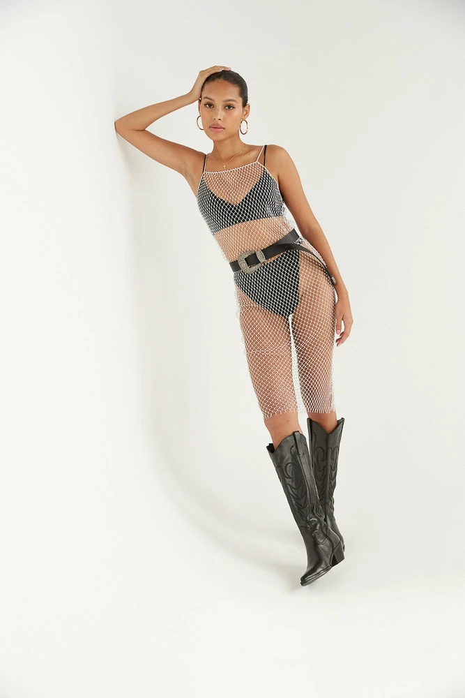 Get festival ready in the Rico Rhinestone Midi Dress! This mesh statement piece is complete with a straight neckline, a low back design, a netted rhinestone bodice, and thin crochet straps. Wear it over a bikini, your favorite dress, and more! Perfect for your next beach day, festival, or night out. Available in white and silver. Pair with the Agency Western Boots by Matisse to get the look!