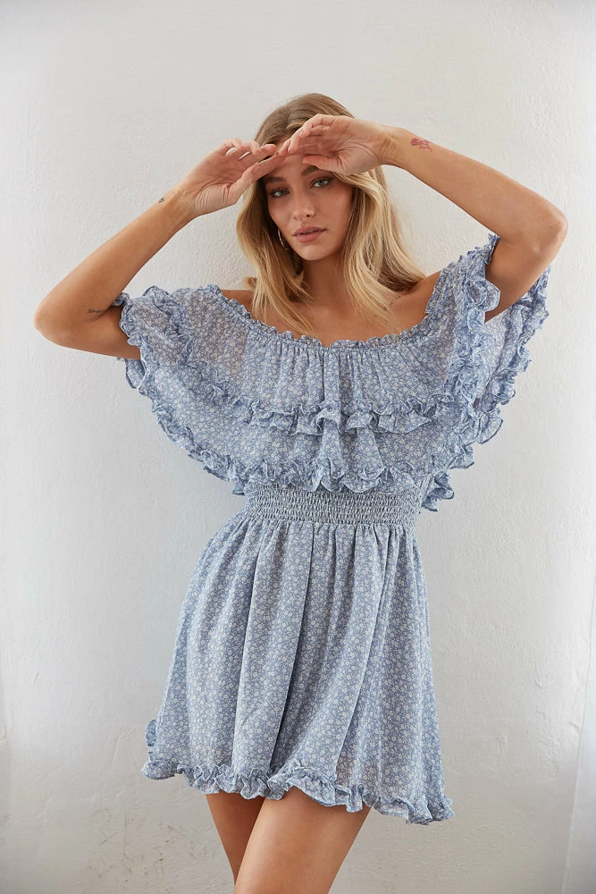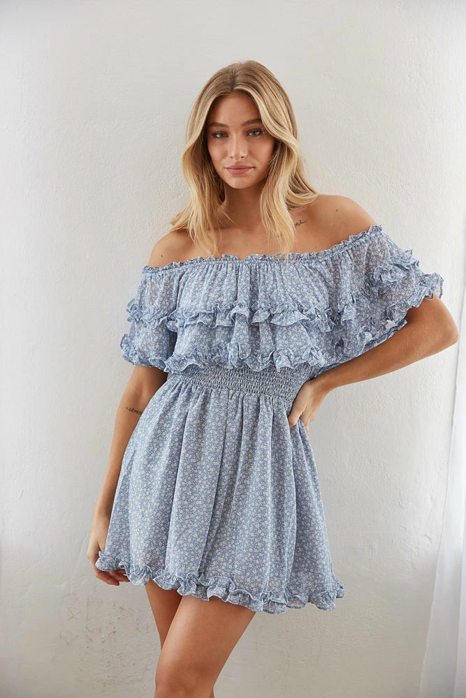 Hey dream girl, you need the Secret Garden Mini Dress in your closet! Featuring an off the shoulder neckline, draped ruffle details, a smocked waist for a cinched look, a dainty floral print, and a ruffle trim throughout for a flirty final touch. Available in blue and white. Step into the Unite Snake Ankle Boot to complete the look!