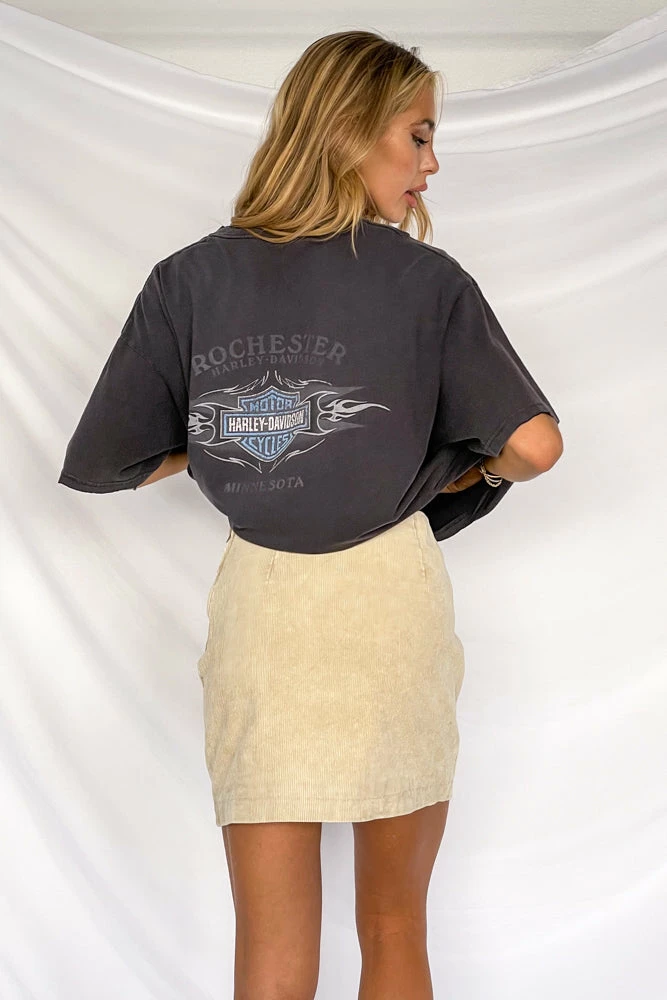 Our chic Pasadena Corduroy Mini Skirt is the perfect staple for your wardrobe! This vintage inspired mini is super chic featuring a flirty high rise, a soft cord design, and a relaxed silhouette. Available in beige. Style with one of our Vintage Tees for a retro inspired look!Â
