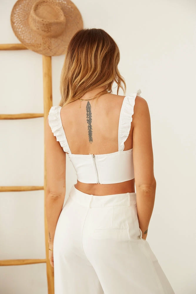 Turn up the heat in the Paulina Ruffle Crop Top! This adorable tank top features a sweetheart neckline, an adjustable front tie detail, a ruched bust for a bustier look, and flirty ruffle straps to complete this perfect closet staple. Available in black and white. Throw on the Eloise Mesh Gingham Mini Skirt for a flirty final touch.