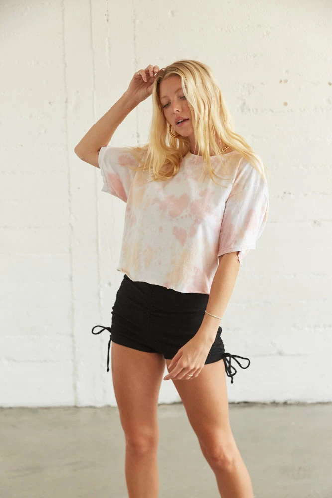 Get ready to live in the Rebecca Tie Dye Crop Tee. Featuring a boxy cropped silhouette and a raw hem for a vintage feel. Available in a white, pink, and peach tie dye design. Pair with our Lakehouse Jogger Pants to complete this effortless vibe.