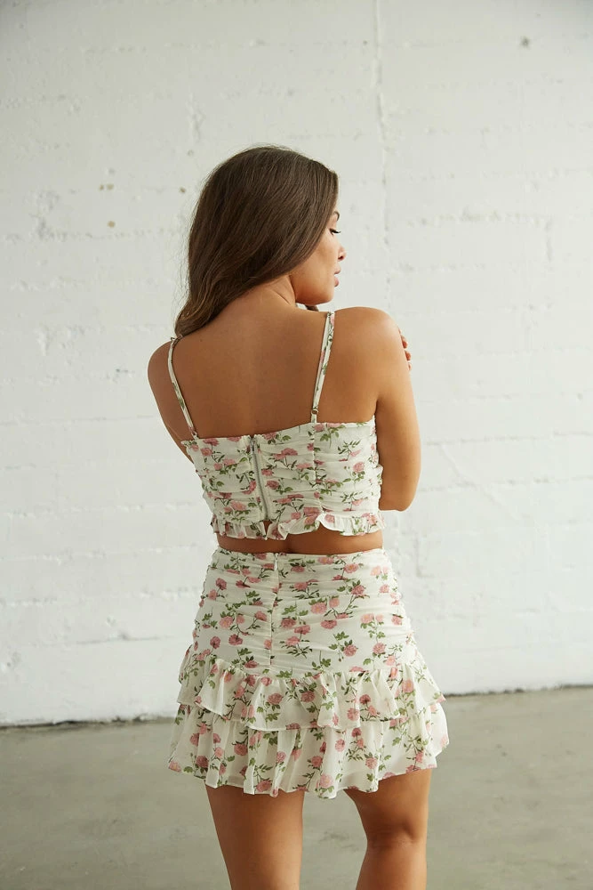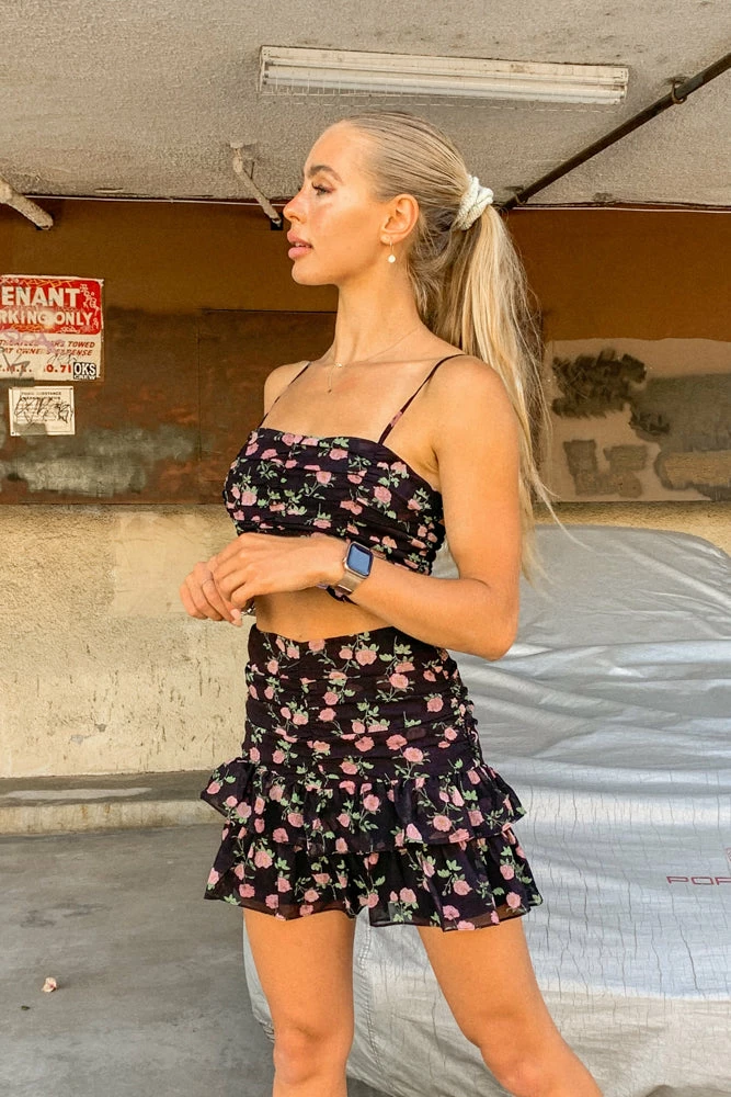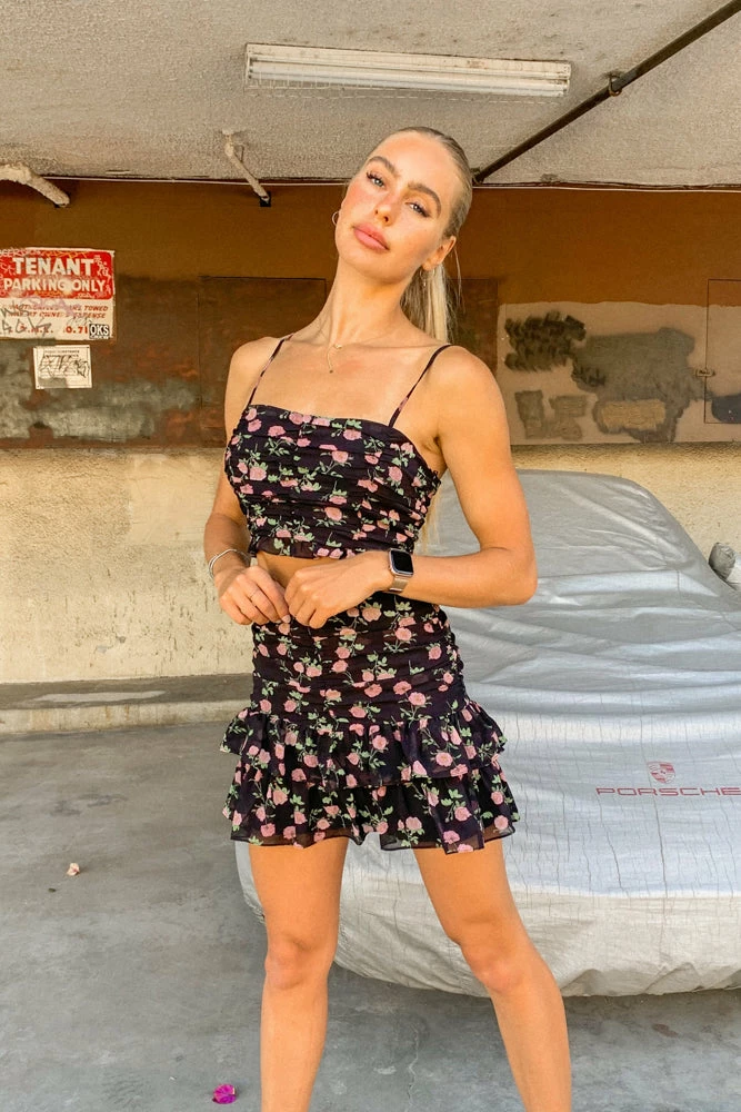 Our Jessica Floral Skirt Set is essential to your summer wardrobe! Complete with a crop tank top with a ruched design and a ruffle trim. The matching high rise skirt is ruched with a double ruffle design for a flattering fit. Available in a floral print in black or white. Top it off with our Billini North Ankle Boot.
