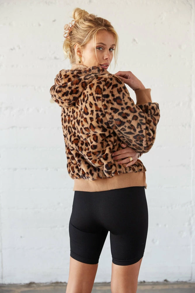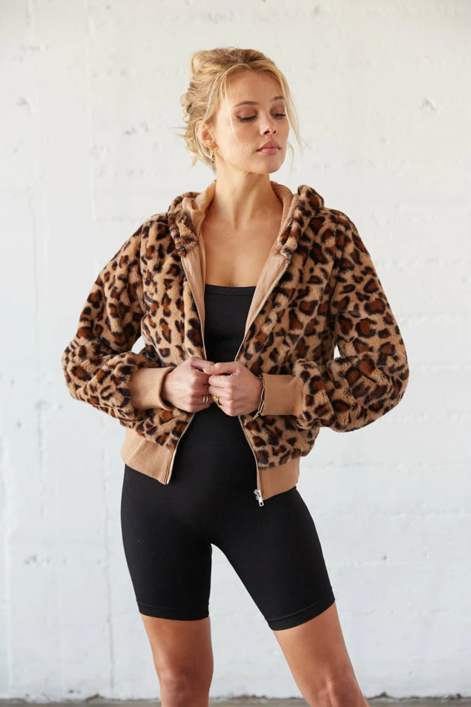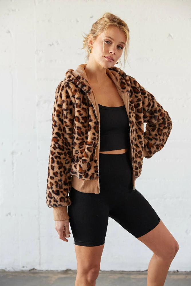 We have the perfect jacket for you, wild thing! The Lenny Crop Cheetah Bomber Jacket is complete with a zip up front, a hood, and soft cheetah faux fur on the outside of the jacket. Available in brown. Style this coat with our Easy Ribbed Biker Shorts In Black for an effortless weekend look.