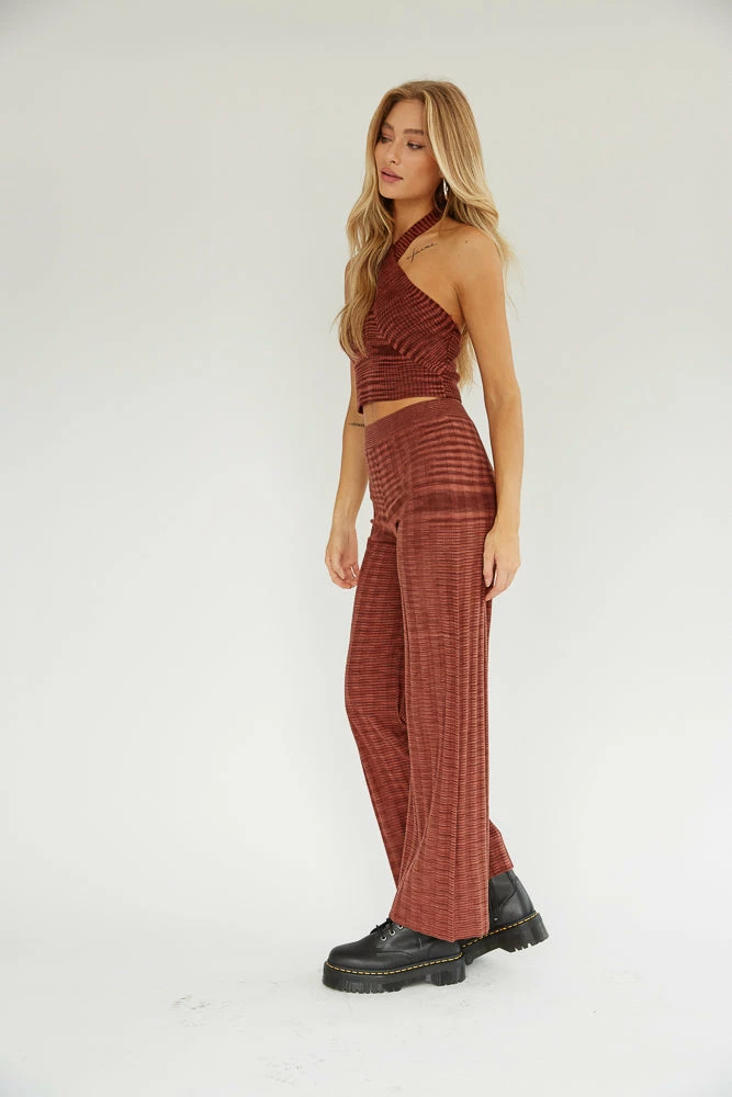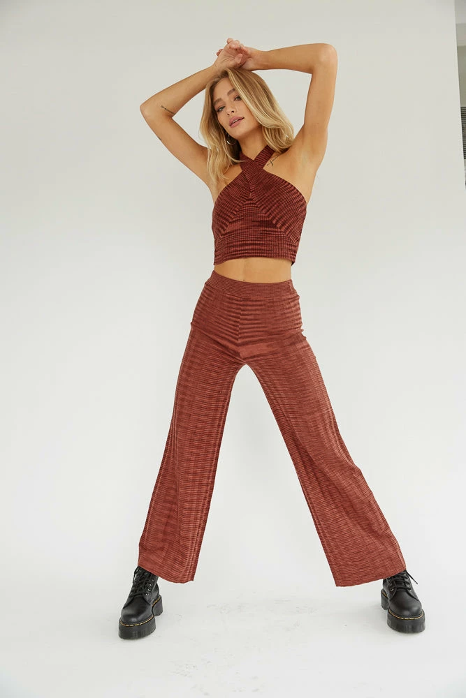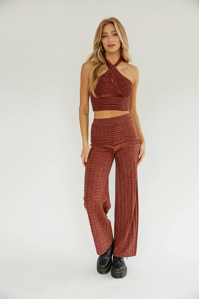 Hey babe, we’re FALLing for the Noel Ribbed Halter Top! This crop top is complete with a criss cross halter neckline, a cozy rib knit design, and a retro striped print throughout. Available in brown. Make this look a set with the Cody Ribbed Wide Leg Pants!