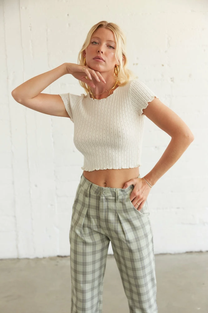 The Oh My Darlin Eyelet Knit Top screams essential! Available in lilac and white, this top adds the perfect amount of cool to the girl next door look. Complete with a curly edge hem detailing, a fitted cropped silhouette, and a ribbed pointelle knit design! Available in lilac and white. Style with the By The Way Wrap Skort to complete this sweet look!Â