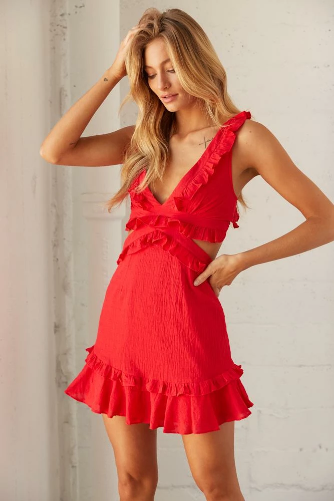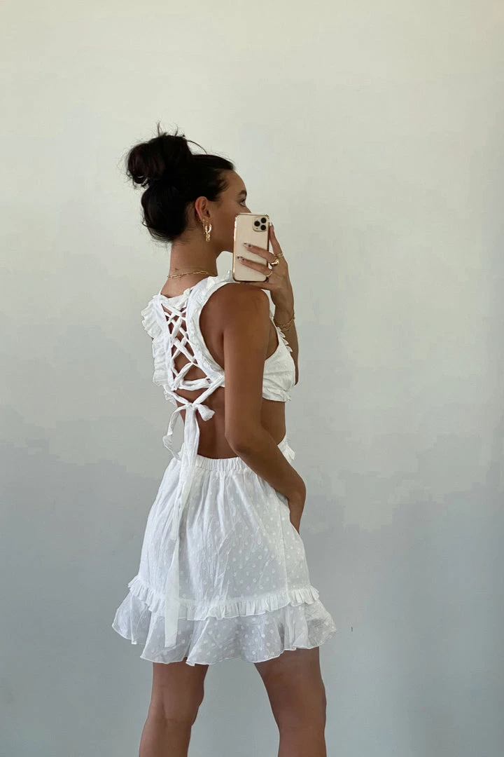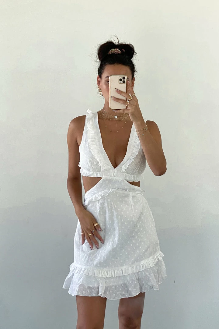 Picture perfect in the Phoenix Cut Out Mini Dress! Featuring a plunging v neckline, side cut out details, an adjustable lace up back design, ruffle detailing throughout, and a subtle monochrome dotted pattern. Available in white. Pair with the Chrome White Lace Up Heel to top off this fresh summer look!