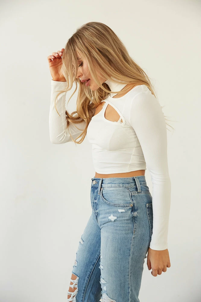 Add a little edge to your ‘fit with the Rogue Cut Out Crop Top! Featuring a mock neckline, cut out details at the front and back, and a stretchy ribbed design. Available in white. Pair with the Tonya Vegan Leather Mini Skirt for a party ready look!