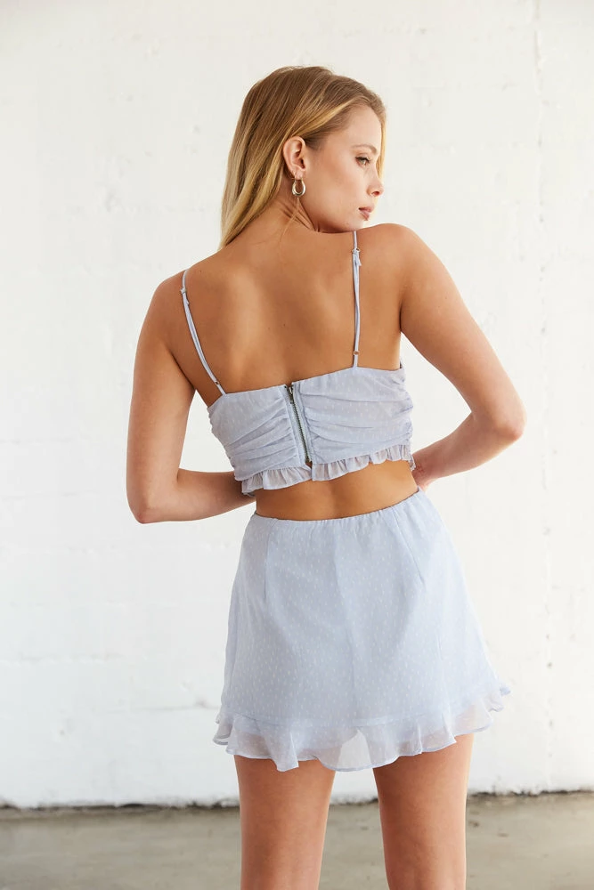 Oh, baby! The Romee Printed Crop Tank is the perfect spring piece for your wardrobe. This top is complete with a front tie keyhole detail, a sweetheart neckline, a ruched cropped body, and a pointed hemline for a flirty final touch! Available in peach and blue. Style with the Holland Cinched Mini Skirt to make this look a set!
