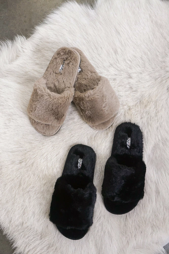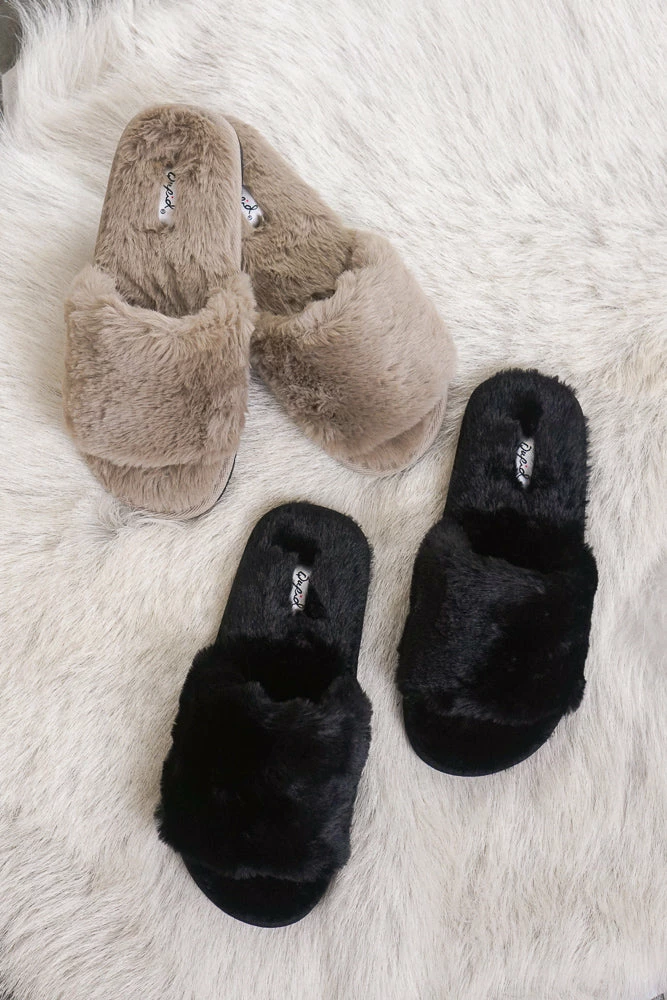 The Stacie Furry Slides are the perfect pairs for all your cozy looks! Featuring a slip on design and comfy lightweight feel. Available in taupe.Â